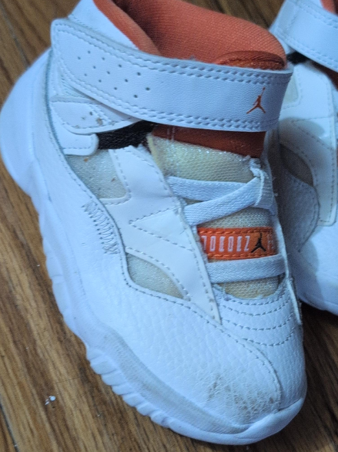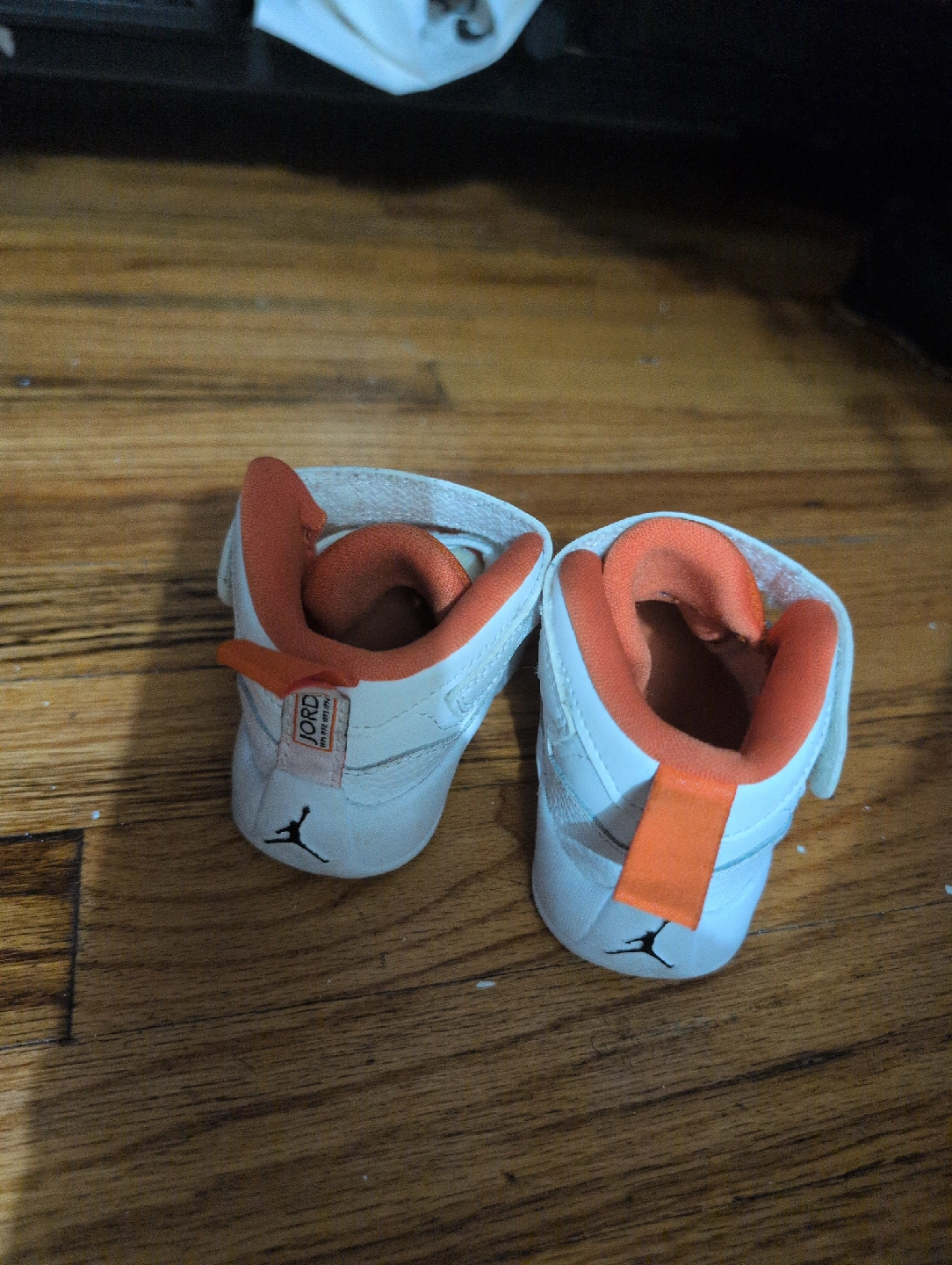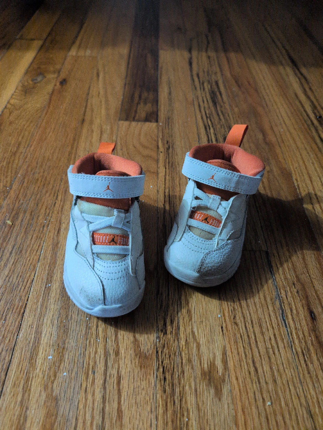 Selling a pair of Jordan 11 Retro Little Flex TD shoes in toddler size 4! They're white with orange accents and feature the iconic Jordan logo. These are perfect for your little one to step out in style!