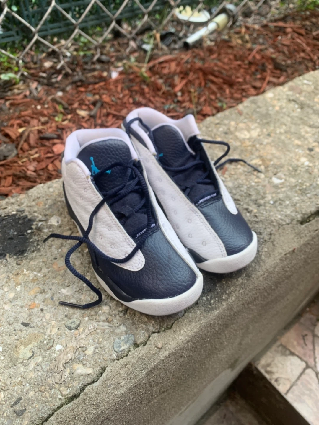 Here are a pair of Jordan 13 Retro Low toddler shoes! They are navy and white. They look to be in good condition. Perfect for your little one!