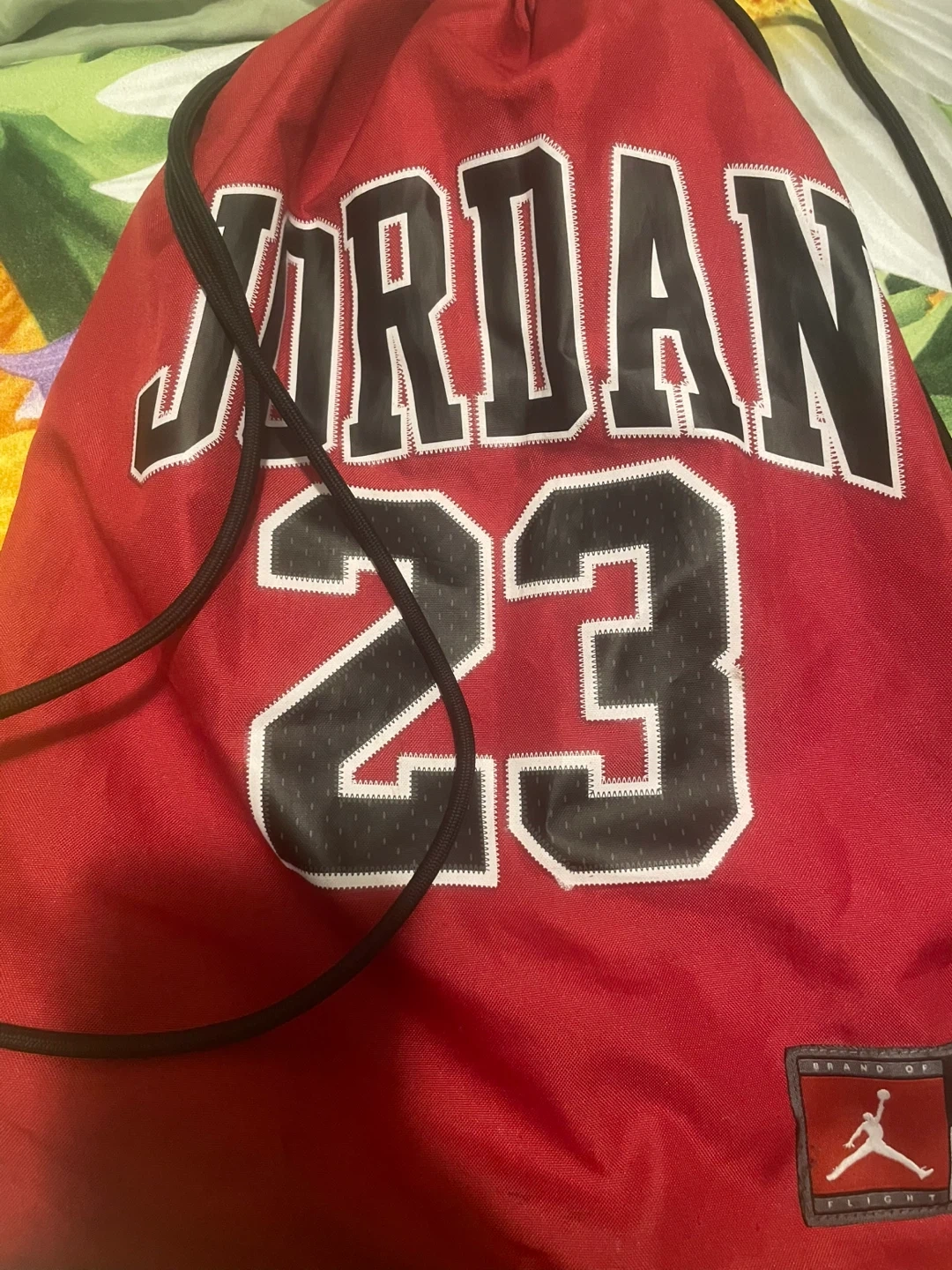 Here's a red Jordan drawstring bag featuring the number 23. Perfect for carrying your essentials!