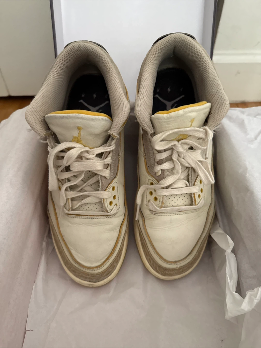 Selling a pair of Jordan 3 Retro Muslin sneakers in US size 8. These come with the original box. They have some signs of wear, as you can see in the photos.