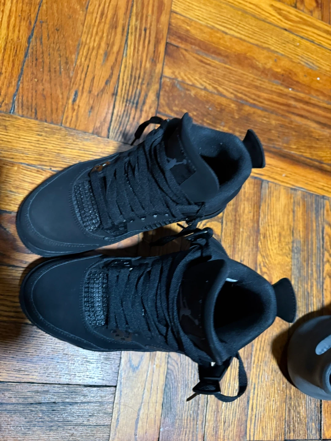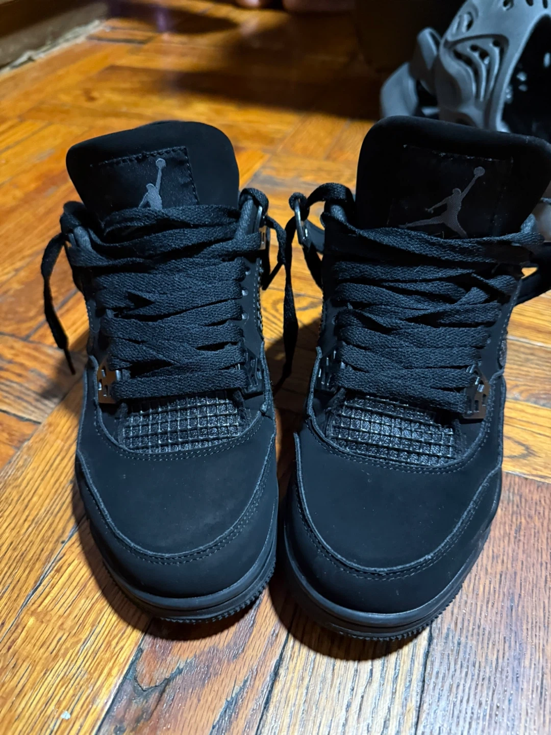 Selling a pair of Jordan 4 Retro Black Cat shoes. They are in good condition and have a sleek, all-black design. Perfect for casual wear or hitting the court!