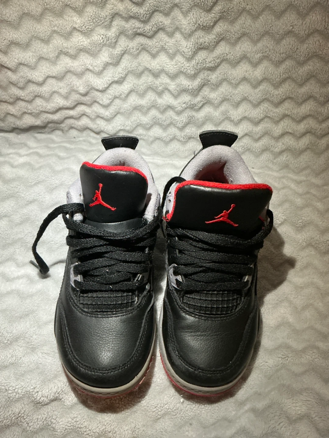 Selling a pair of kids size 12 Jordan 4 Retro sneakers in black and red. These are in really good condition