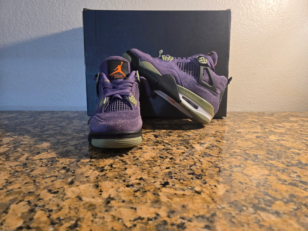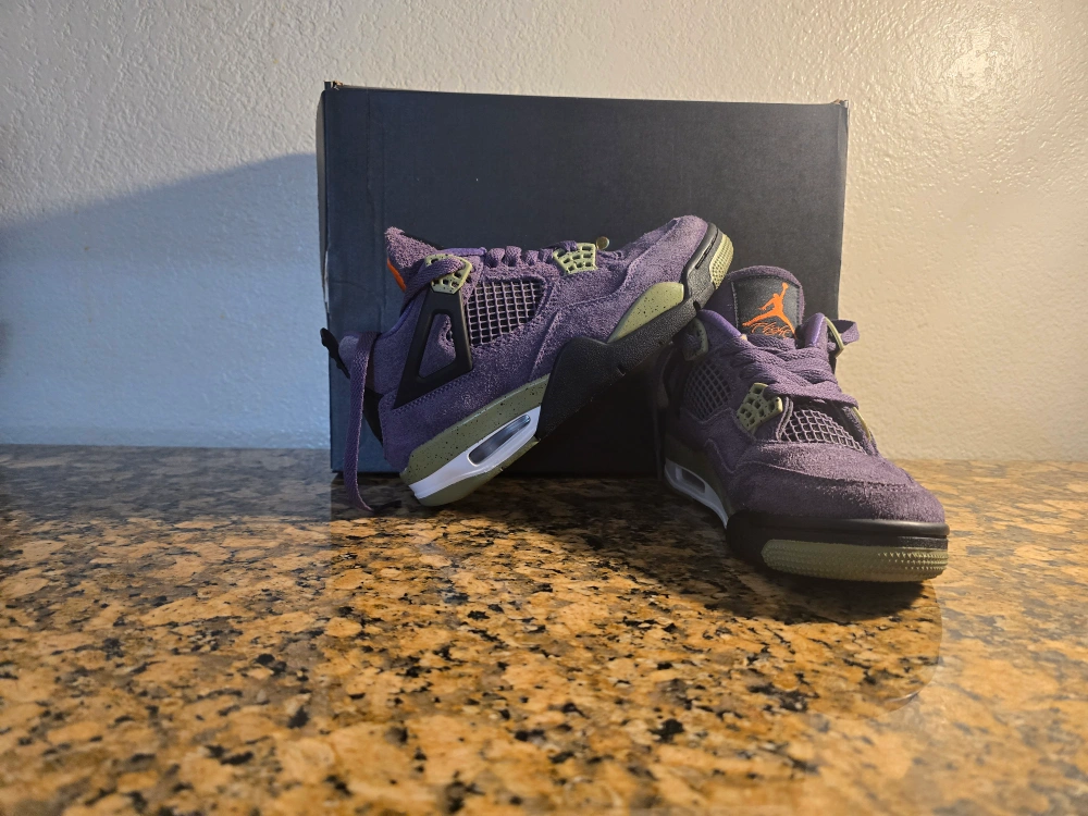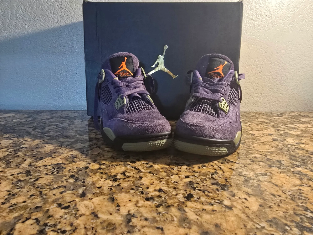 Selling a pair of PRE OWNED Jordan 4 Retro Purple canyons They are in great condition. The shoes feature a stylish purple and olive colorway.