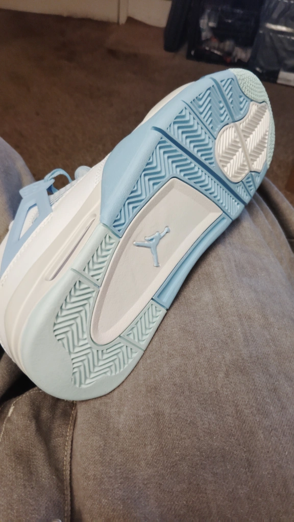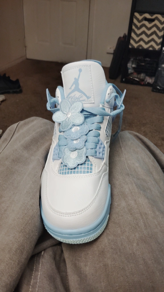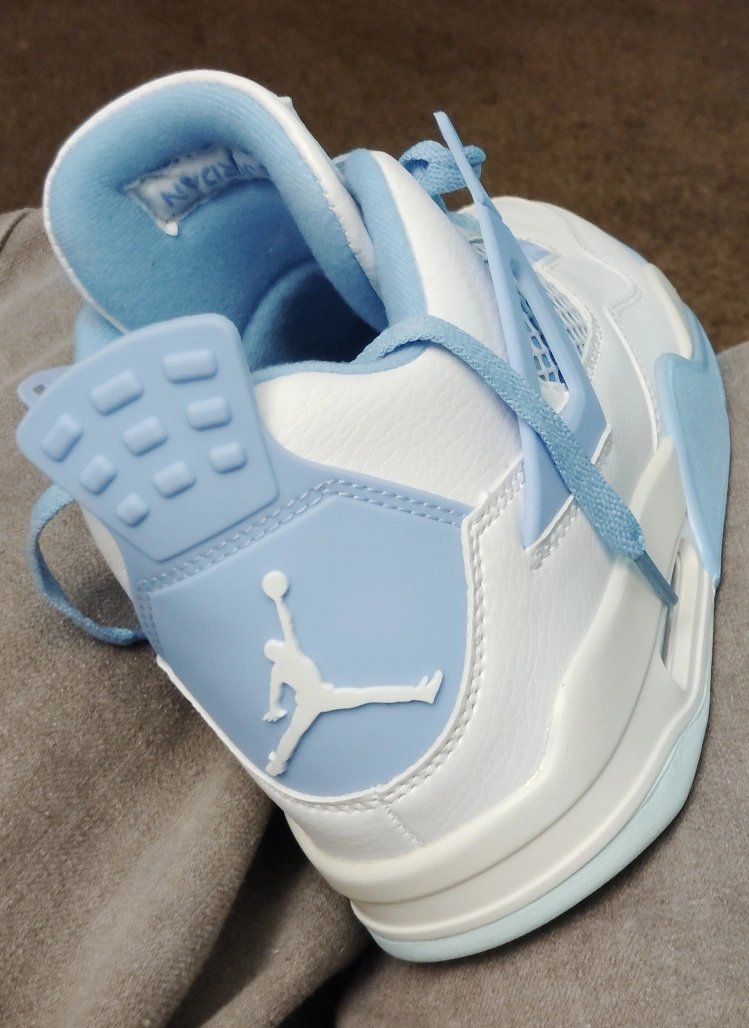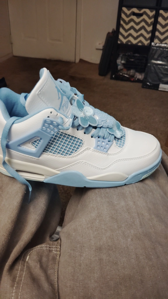Jordan 4 Retro in University Blue colorway. These sneakers are in great condition and ready for a new home! They feature the iconic Jumpman logo and a stylish design that stands out. Perfect for any sneaker enthusiast