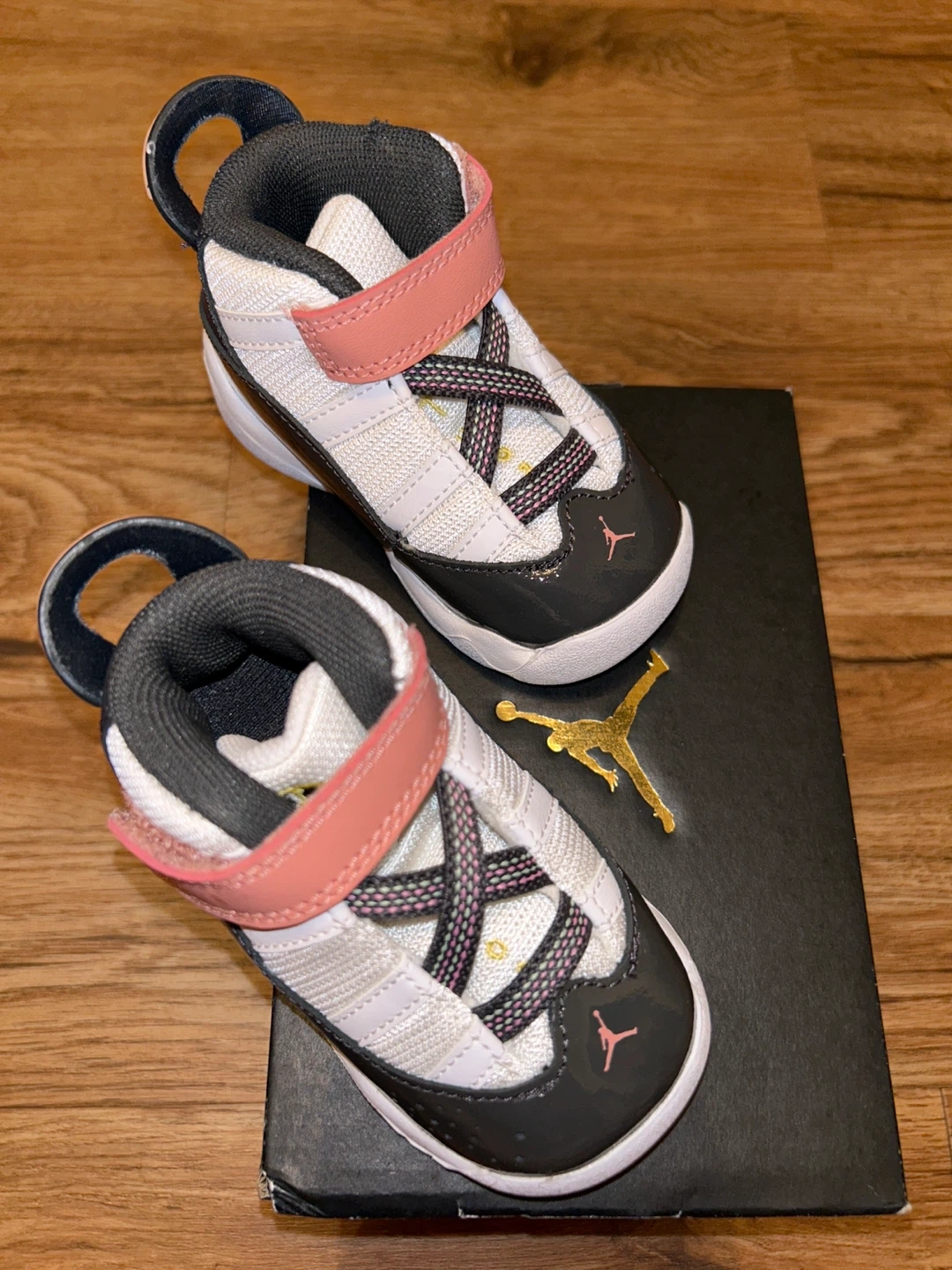 Cute Jordan 6 Rings baby shoes in size 4C! They come with the original box. The colors are white, black, and a touch of pink. Perfect for your little one!