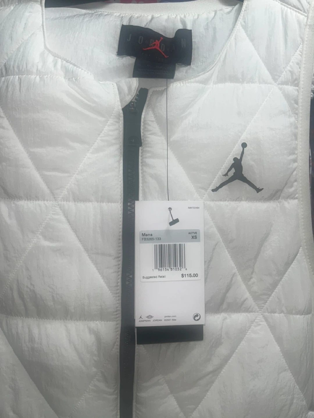 86Selling a Jordan ACTVS puffer vest in size XS! This stylish vest is white and features the iconic Jordan logo. The tag shows a suggested retail price of $115. It's in great condition and ready for a new home!