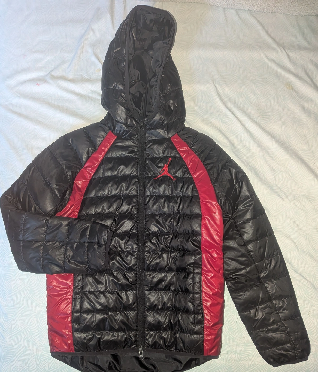 81Vendo una chaqueta acolchada Jordan negra con detalles en rojo. ¡Está en perfecto estado y lista para estrenar! La chaqueta tiene cremallera completa y capucha para mayor calidez y protección contra las inclemencias del tiempo. Talla L de niños