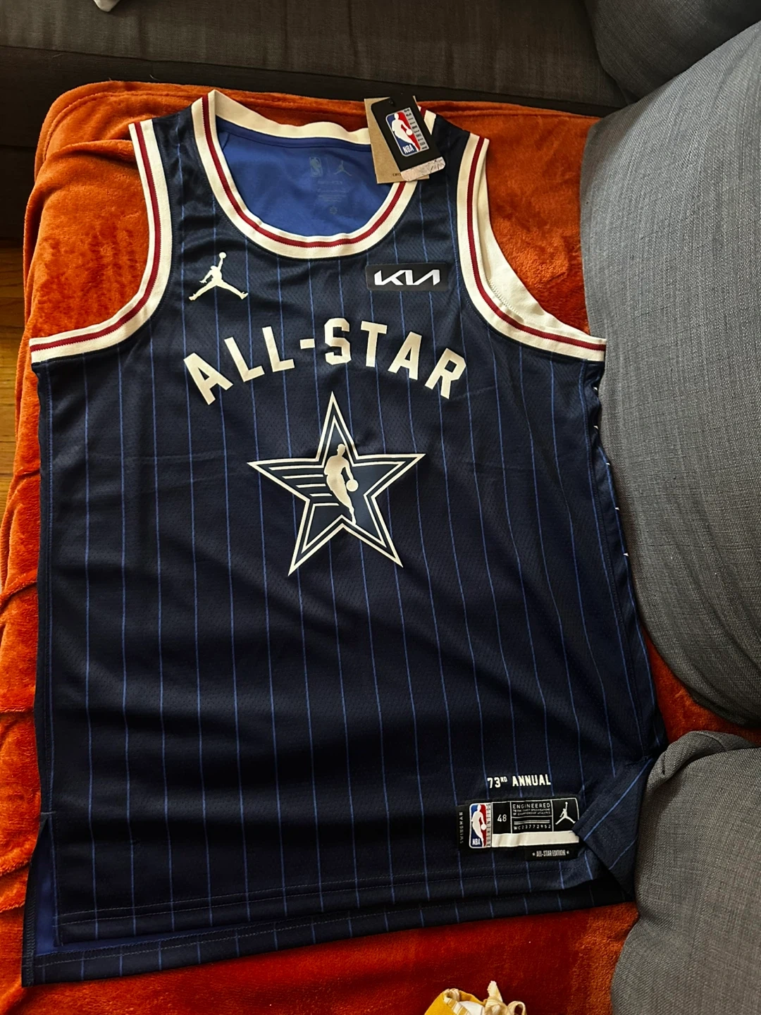Here's a Jordan NBA All-Star jersey in size 48. It's the 73rd Annual edition. The jersey features the Jordan and Kia logos, along with a star design. Perfect for any basketball fan! Serious buyers ,Pick up only
