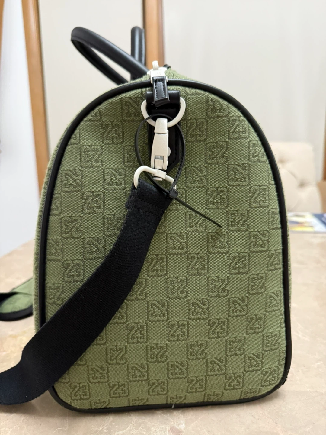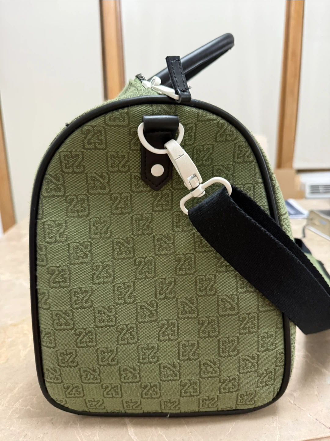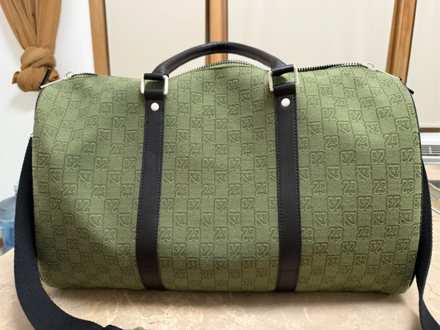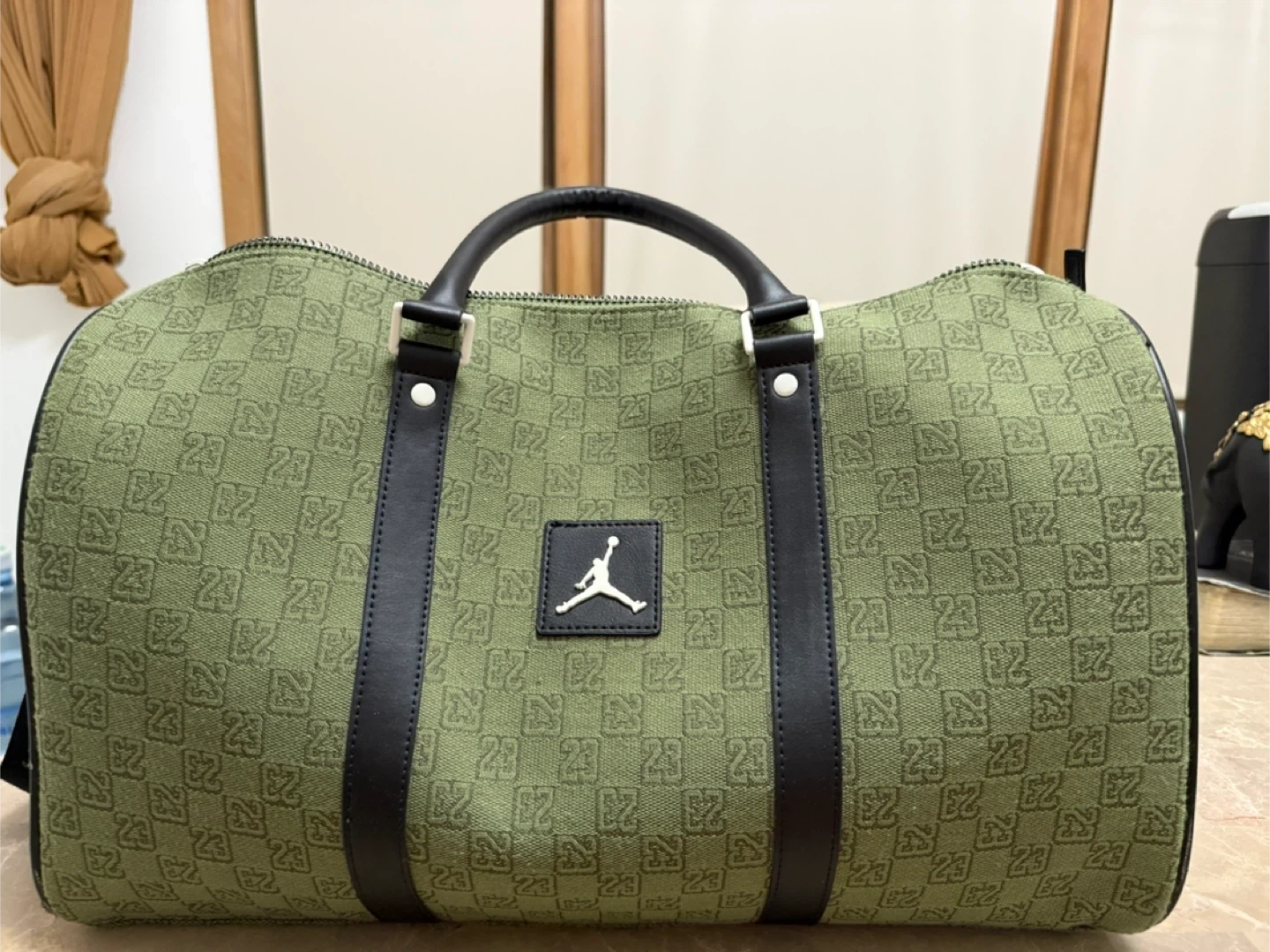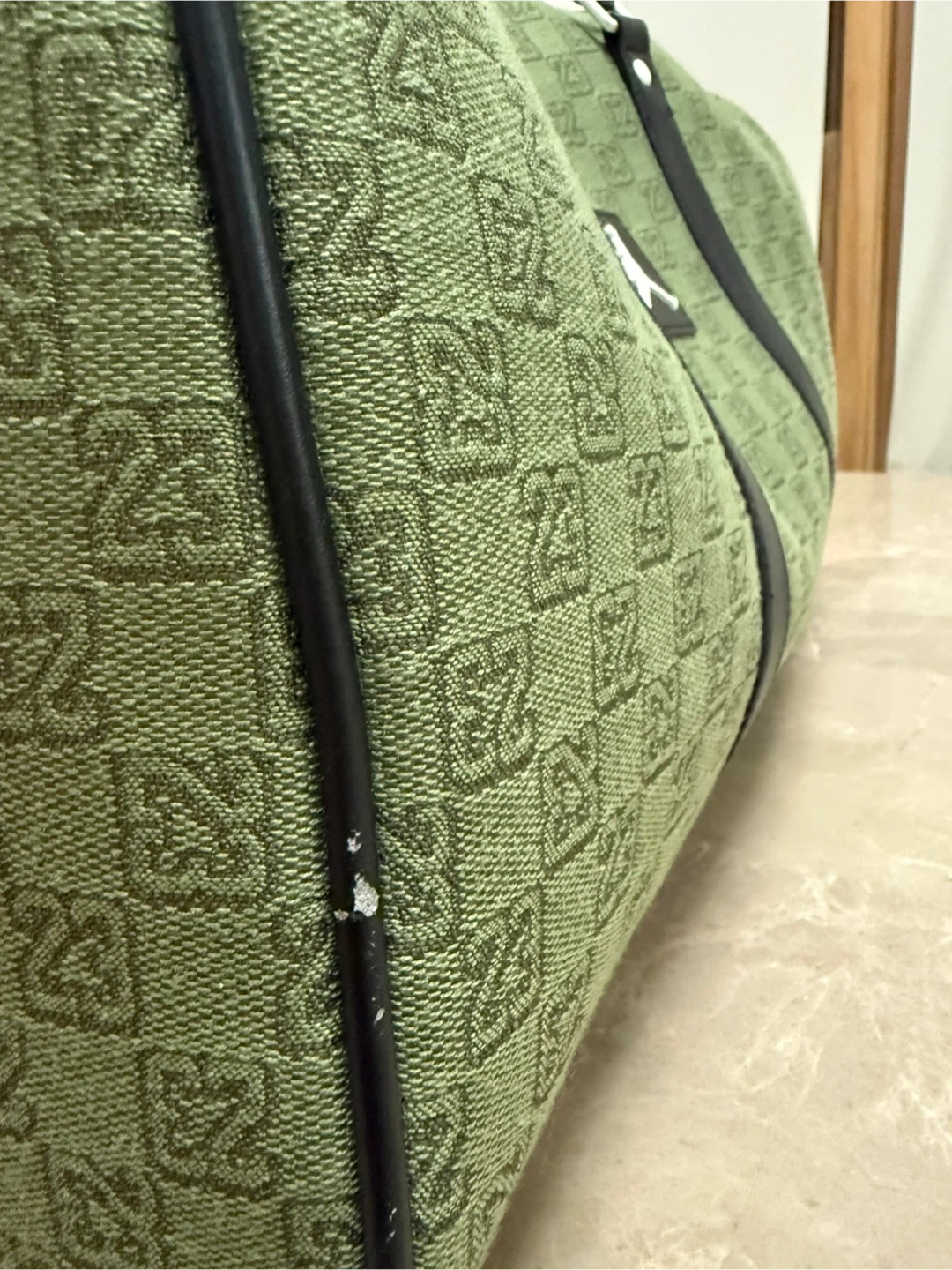 Jordan duffle bag in olive green with a repeating '23' pattern. It features black leather accents and a shoulder strap. There are some minor scuffs on the side, but overall it's in good condition!