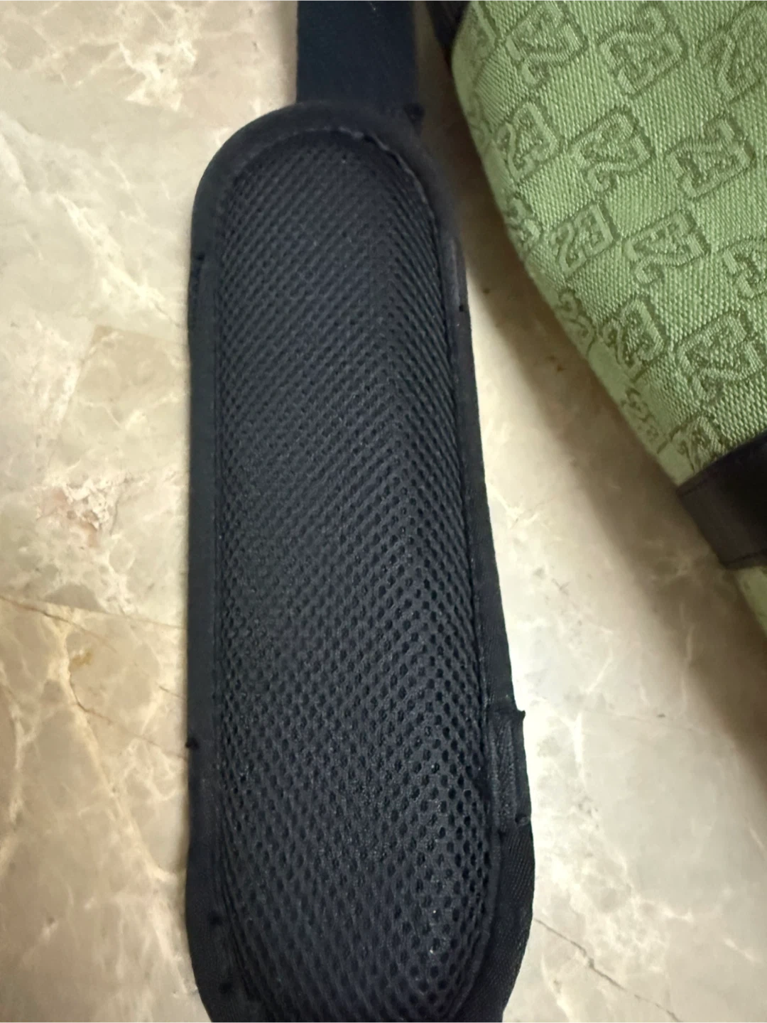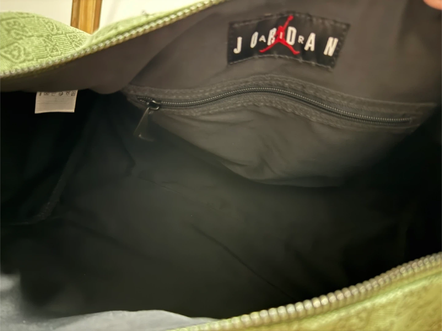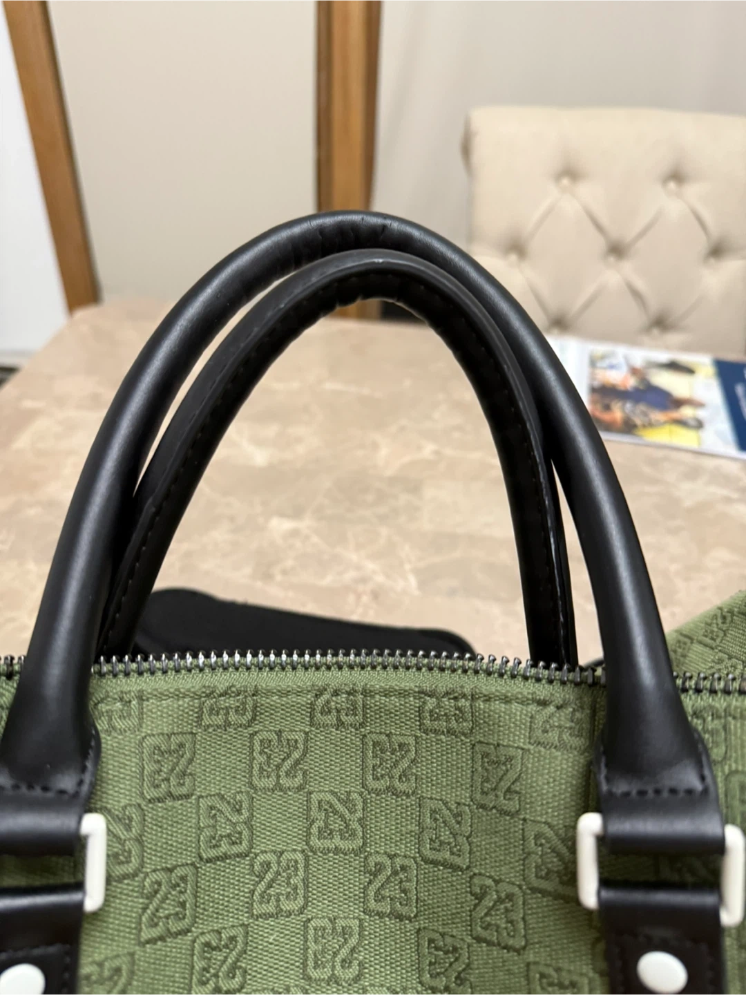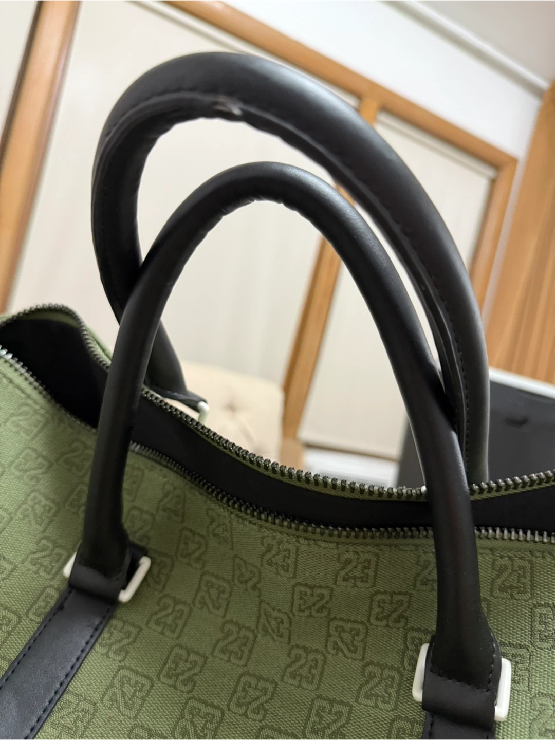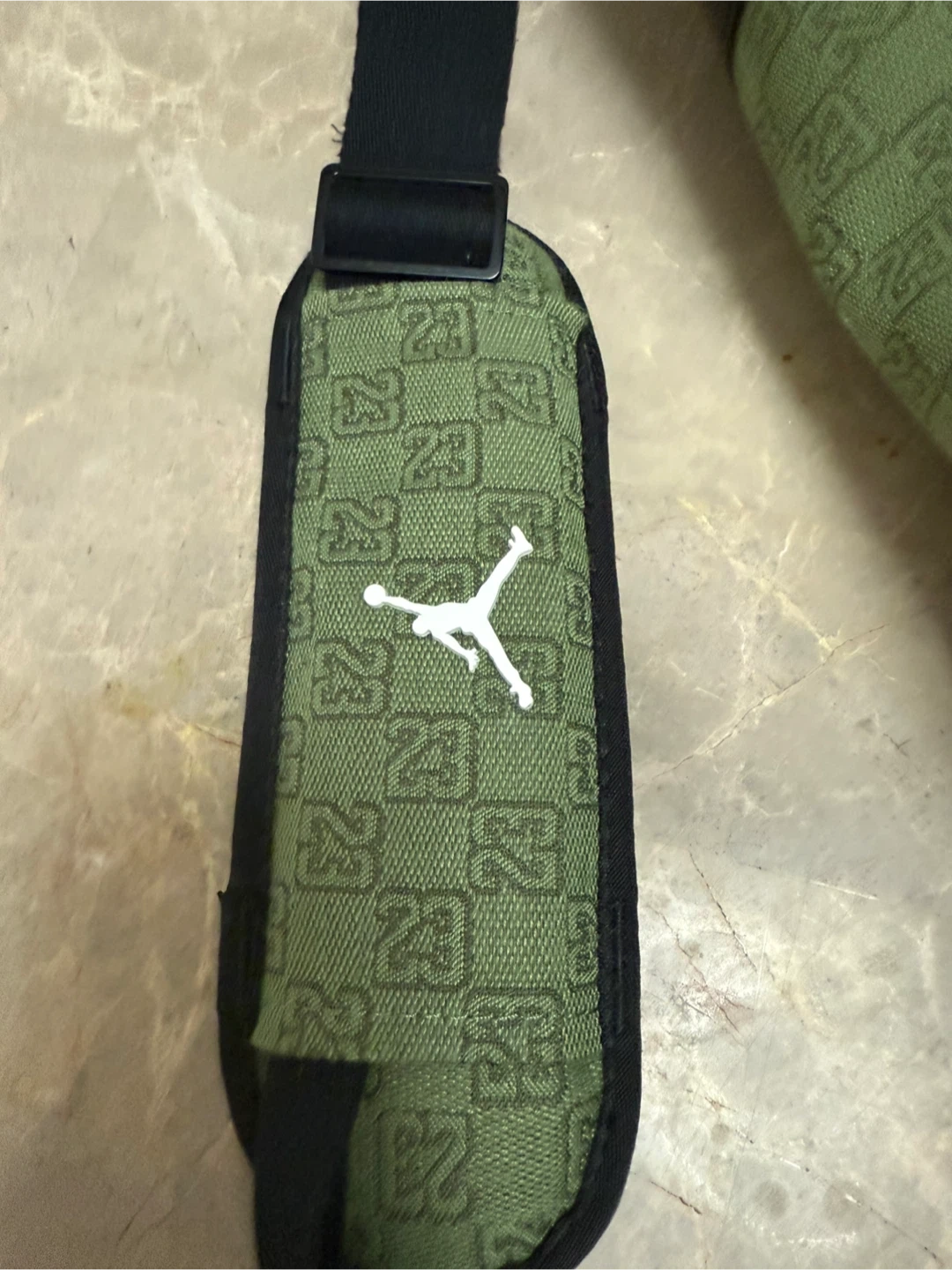 Jordan duffle bag in olive green with a repeating '23' pattern. It features black leather accents and a shoulder strap. There are some minor scuffs on the side, but overall it's in good condition!