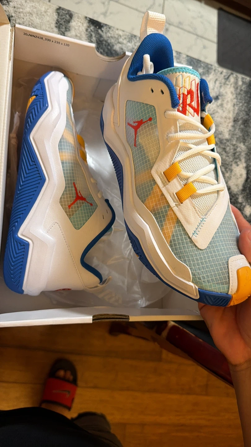 Here are a pair of Jordan Zoom Separate basketball shoes. They come in a white, blue, and yellow colorway and include the original box. Great for on the court!