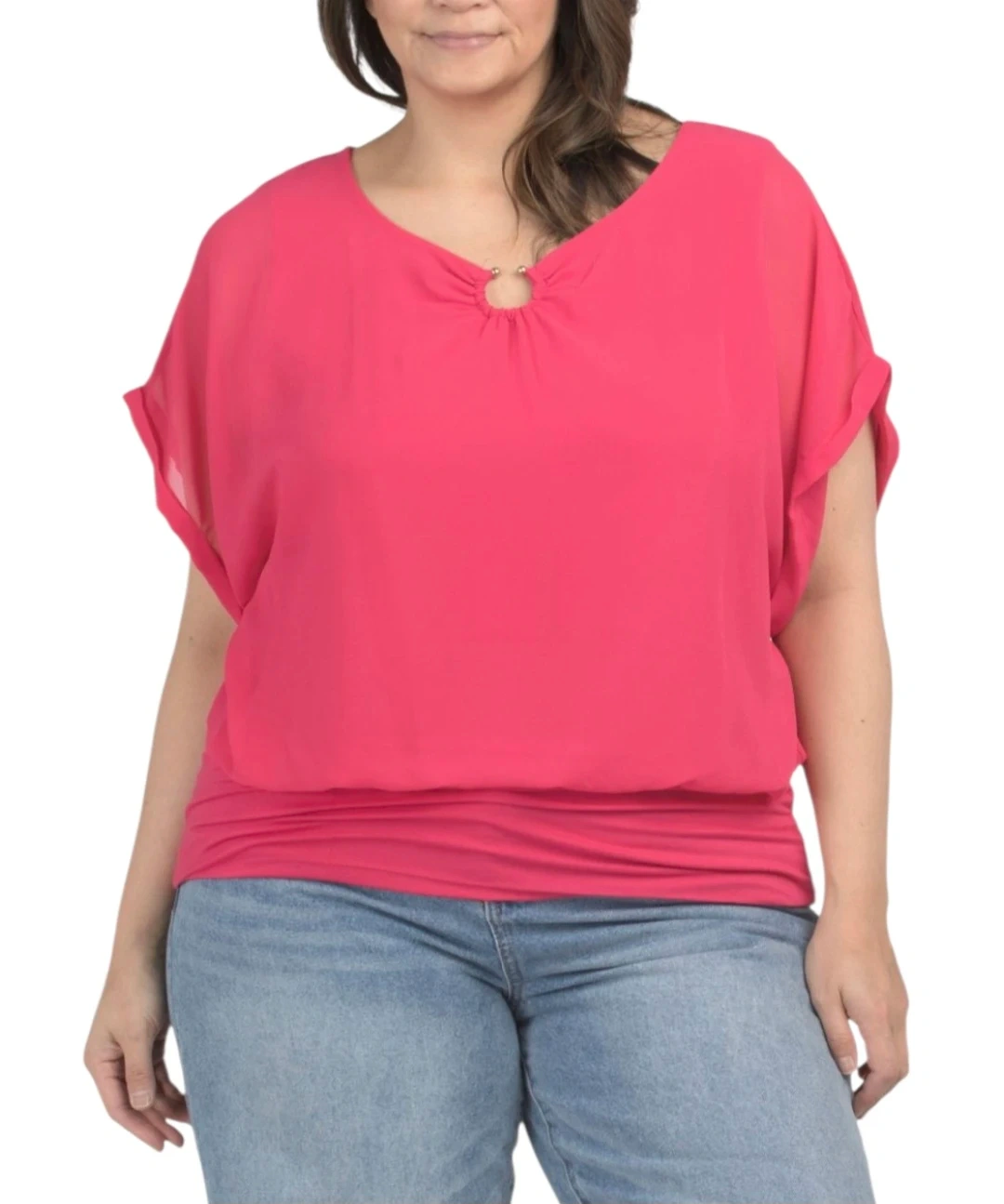 10Description Joseph A plus size chiffon overlay top with a banded bottom hem. Features a ring accent at the neckline and soft dolman sleeves with a relaxed fit. Lightweight, comfortable, and easy to style for casual or dressier outfits. Details: • Brand: Joseph A • Condition: New • Size: 1X • Split neck with ring accent detail • Chiffon overlay with stretch lining • Dolman short sleeves • Banded bottom hem for a flattering fit • Material: Polyester / Rayon / Spandex • Hand wash • Imported Fit Notes: Relaxed and comfortable fit with stretch at hem for shaping