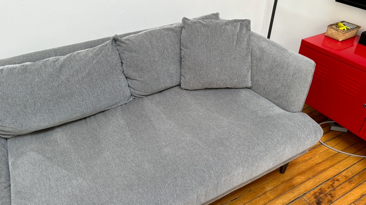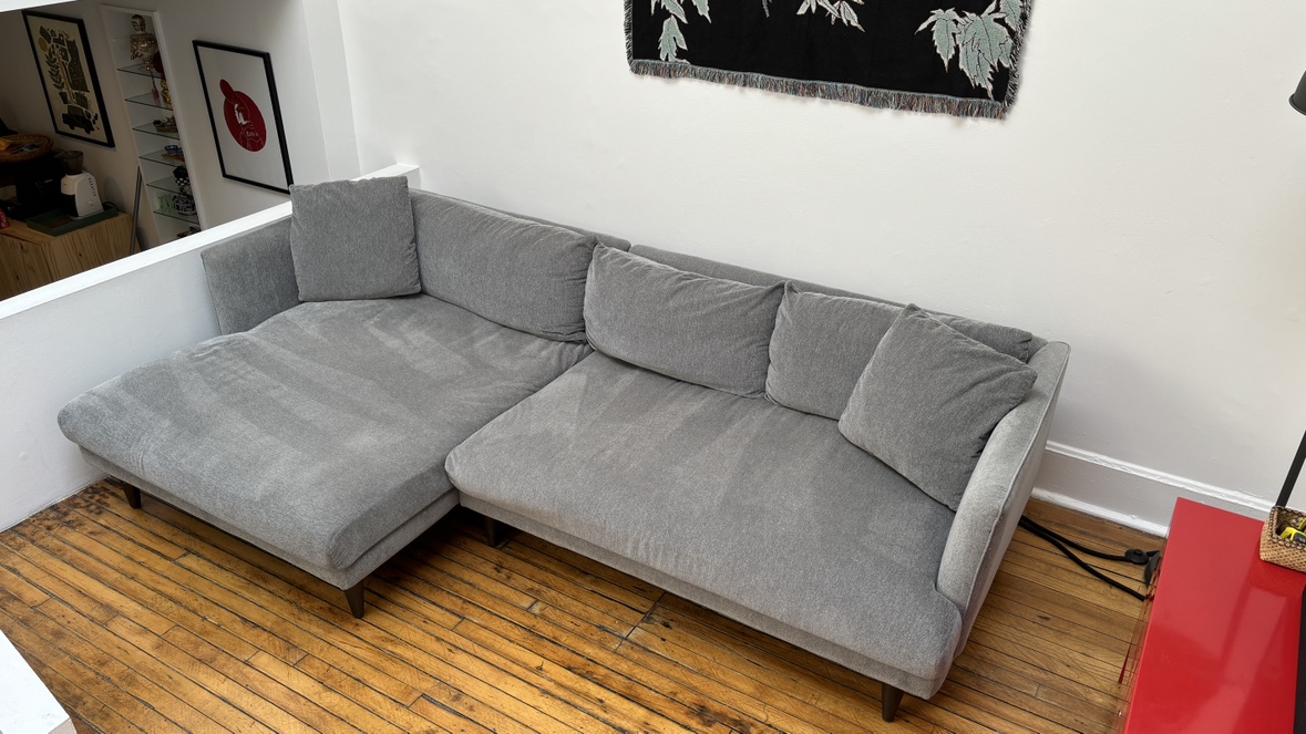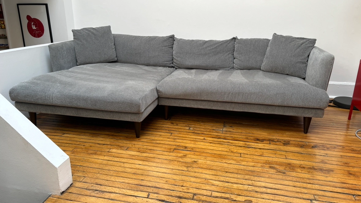 Large gray sectional sofa with four included pillows. This is a very comfortable sofa. Selling our Joybird Lewis Sectional. It’s too big for our space/needs, but we’ll miss it. 😢 Must be able to pick up from Pilsen, Chicago (18th and Halsted) Fabric: Synergy Pewter Wood: Stain Mocha Orientation: Left Leg Option: Cone Legs Size : 108"w x 60"d x 32"h