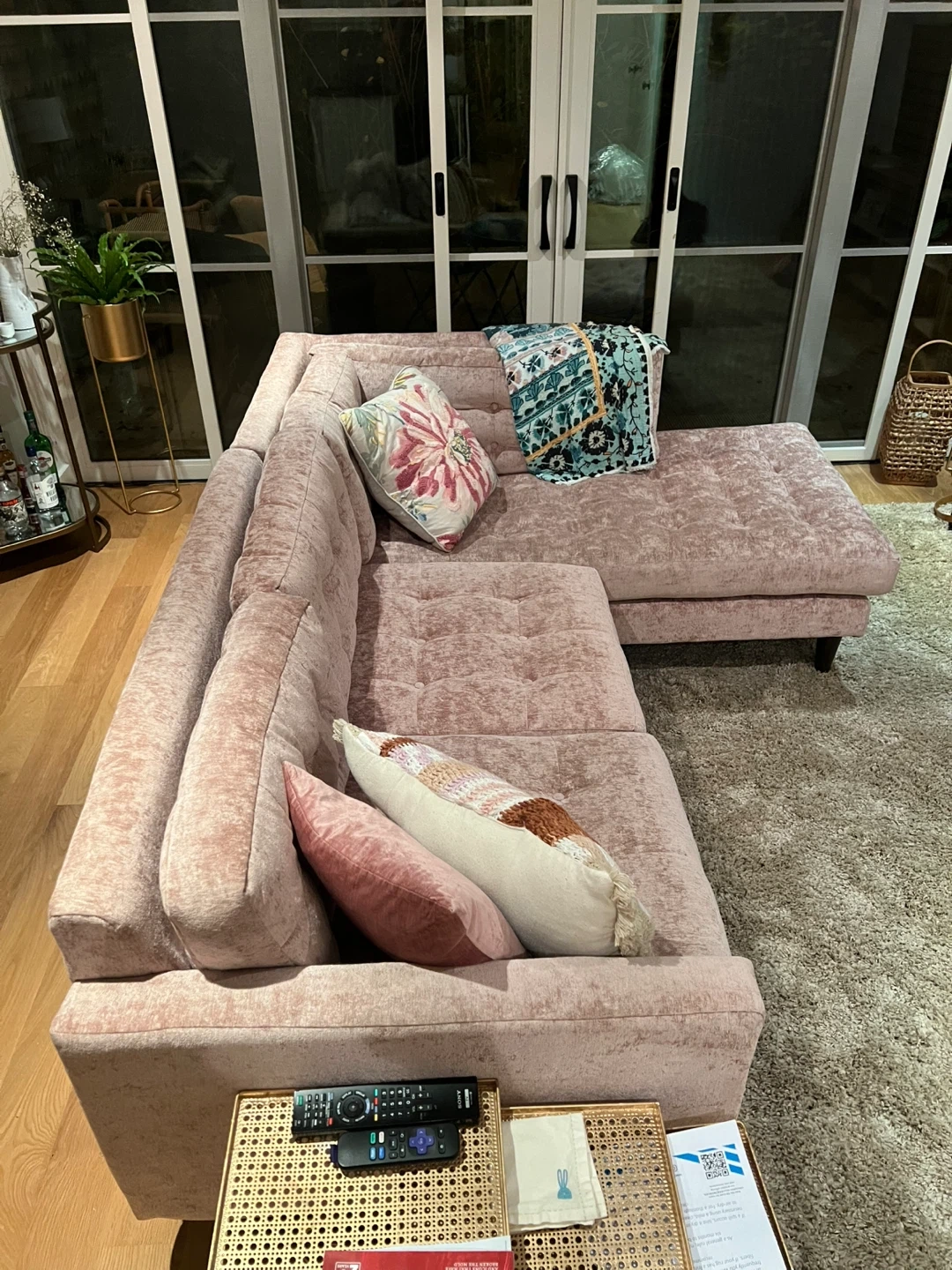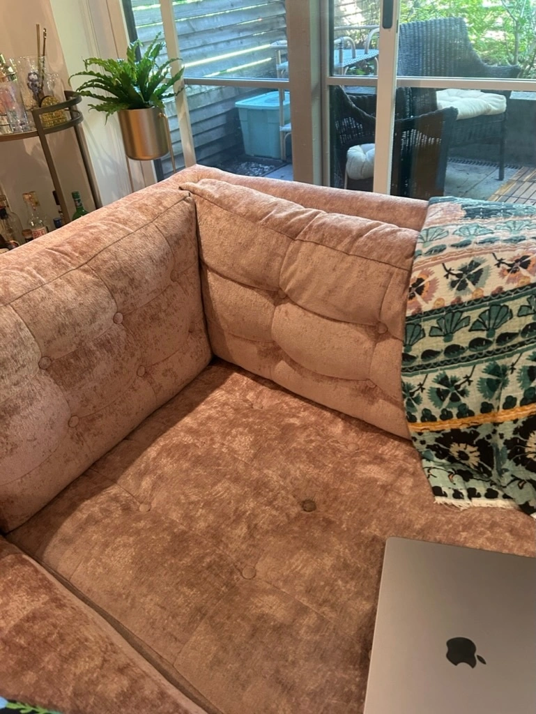 Cute Pink Velvet Couch; very light and easy to move into small spaces ( two pieces separate) Three years old, small stain on chaise and one missing button but overall in very good condition ( See picture 3). From a pet free house. Originally paid 2500. https://joybird.com/apartment-sectional/eliot-apartment-sectional-with-bumper/?fabric=faithful-mocha 89"w x 64"d x 32"h