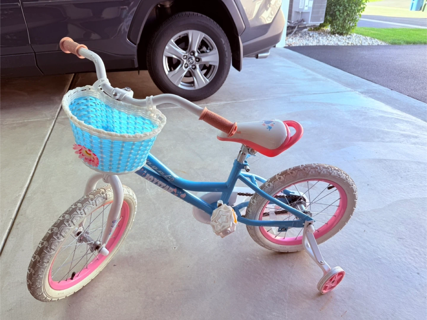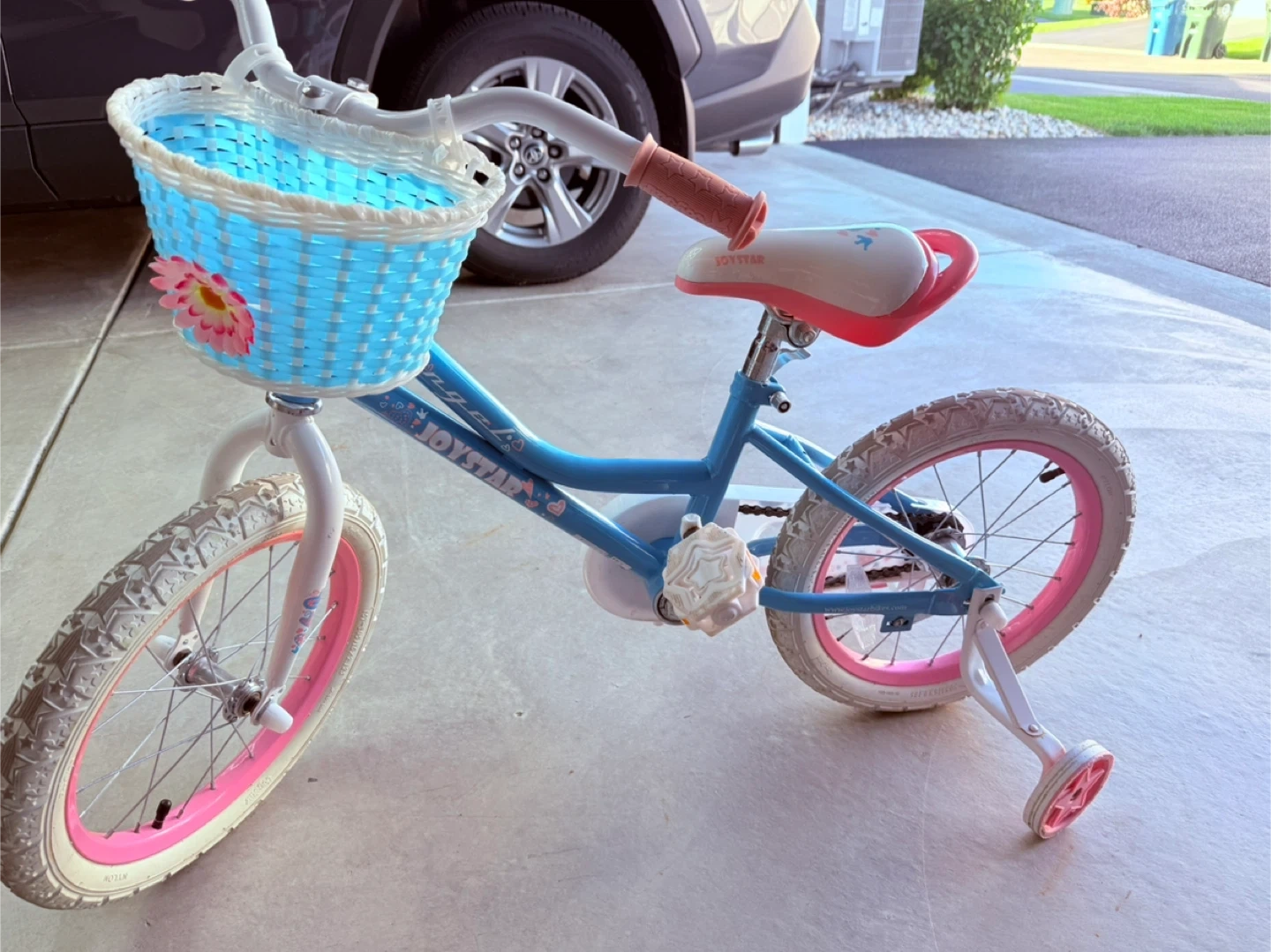 5Selling a cute Joystar Angel girls bike! It's a 16 inch bike in a lovely blue and pink color scheme. Perfect for a little one learning to ride, and it comes with training wheels for added stability