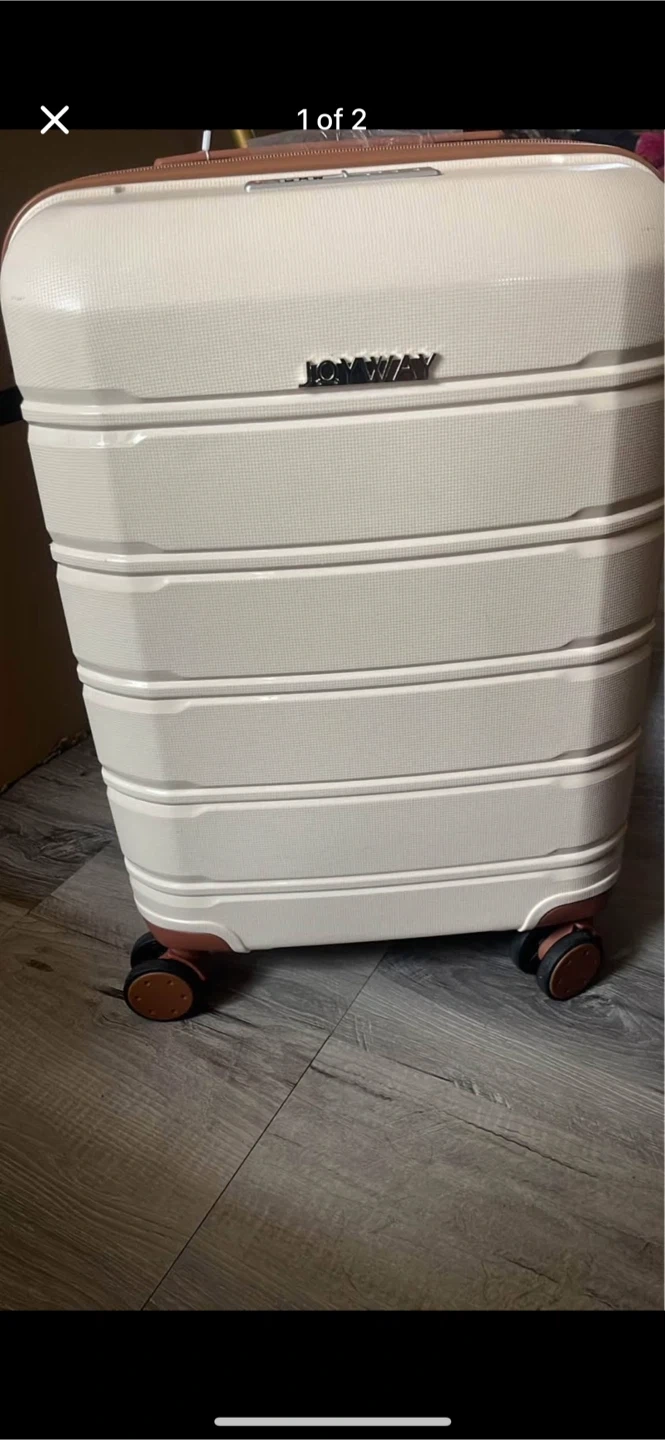36JOYWAY rolling suitcase. It has a cream color and four wheels for easy transport
