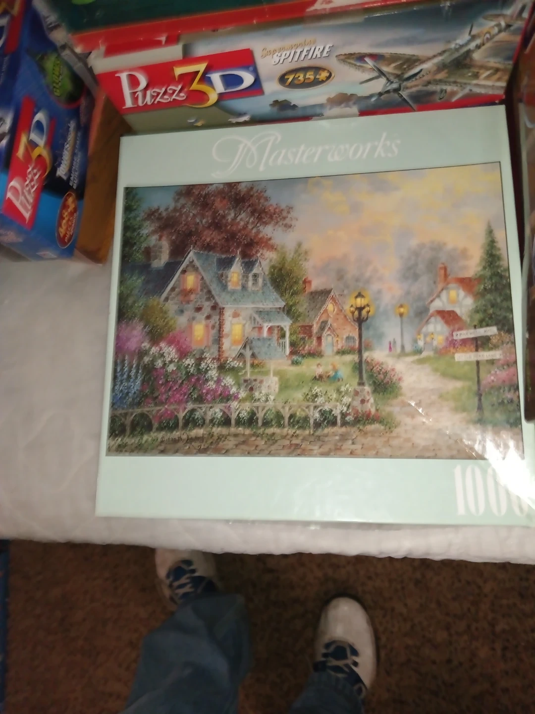 This lot includes several 1000-piece jigsaw puzzles featuring Thomas Kinkade artwork. The puzzles depict various scenic cottage and winter village scenes. They're perfect for a relaxing pastime or display!