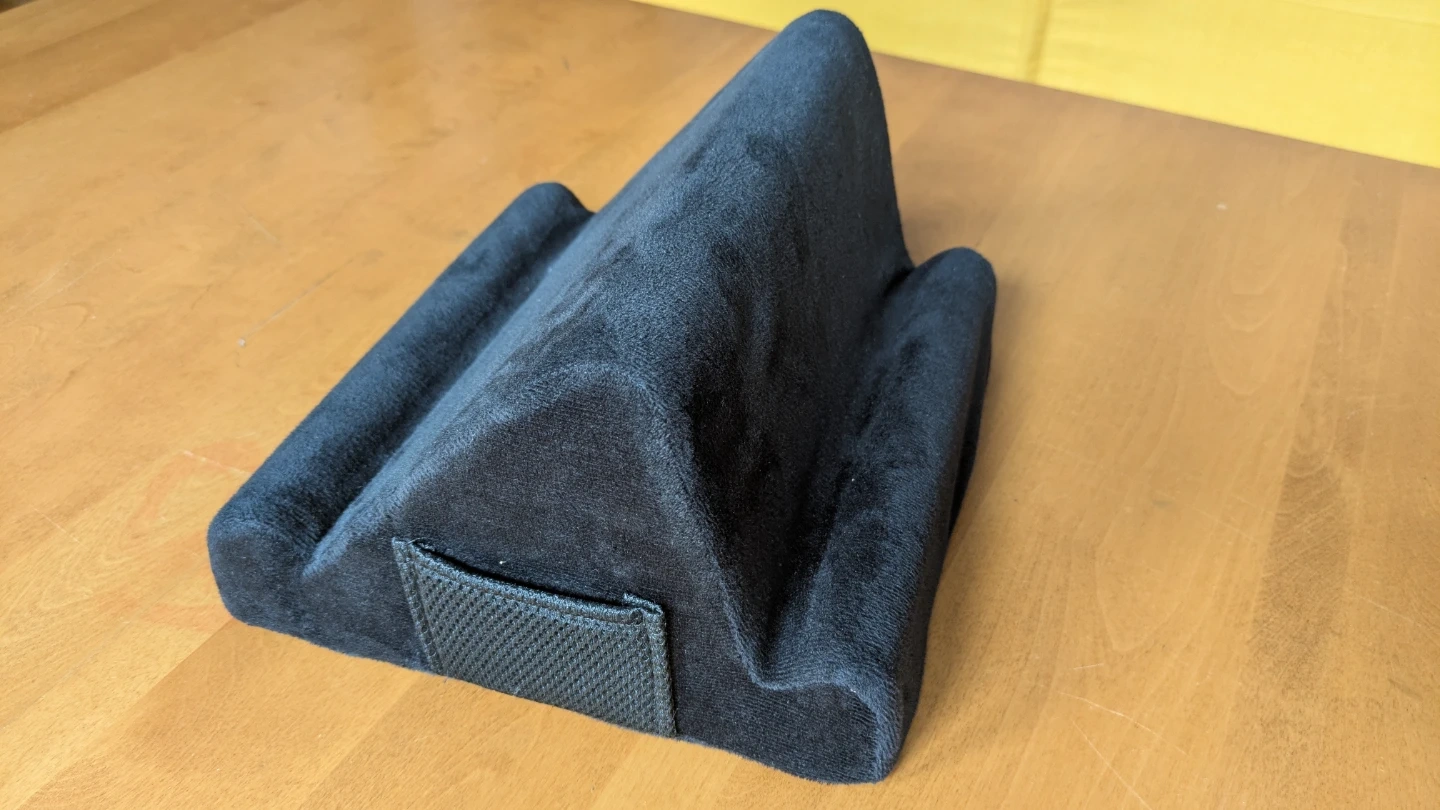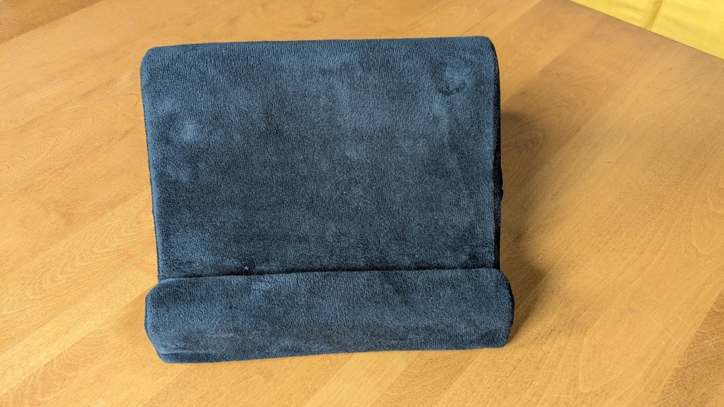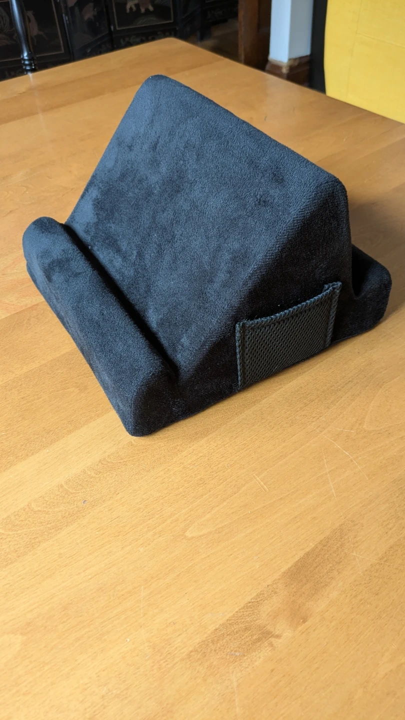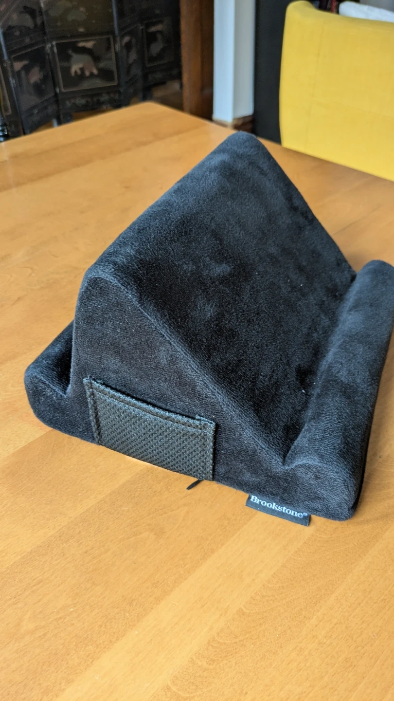 This black tablet pillow stand is made by Brookstone. It's designed to hold your tablet at a comfortable viewing angle. The soft, plush material offers a secure grip for your device.