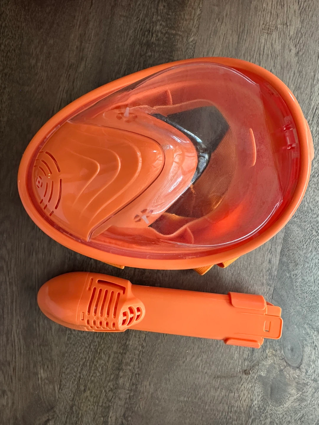 Selling an orange full face snorkel mask! It comes with the snorkel attachment. Perfect for your next snorkeling adventure. It works well and clean.