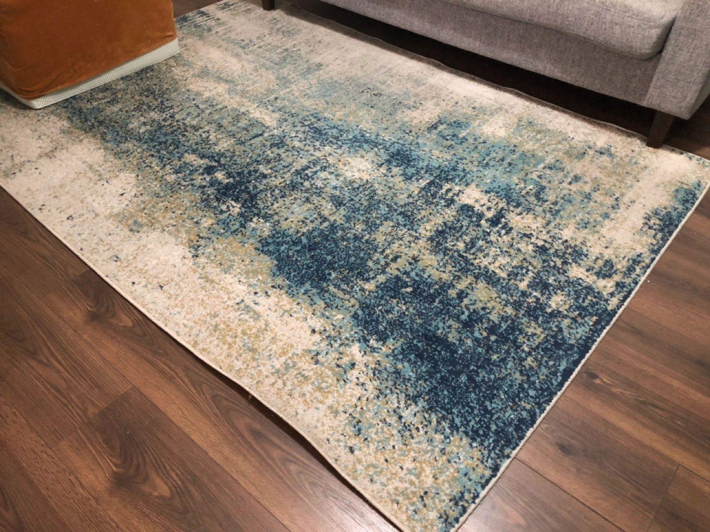 Beautiful abstract area rug. Blues, beige, and greens. Soft texture. Adds style to any room.