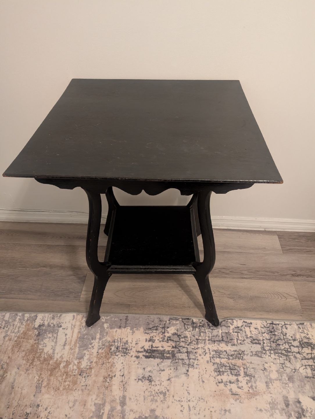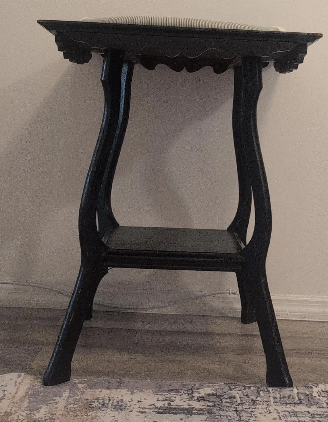 Selling a charming black wooden side table. It's in good condition and has a unique, elegant design with curved legs and a small shelf. Perfect for adding a touch of classic style to any room!