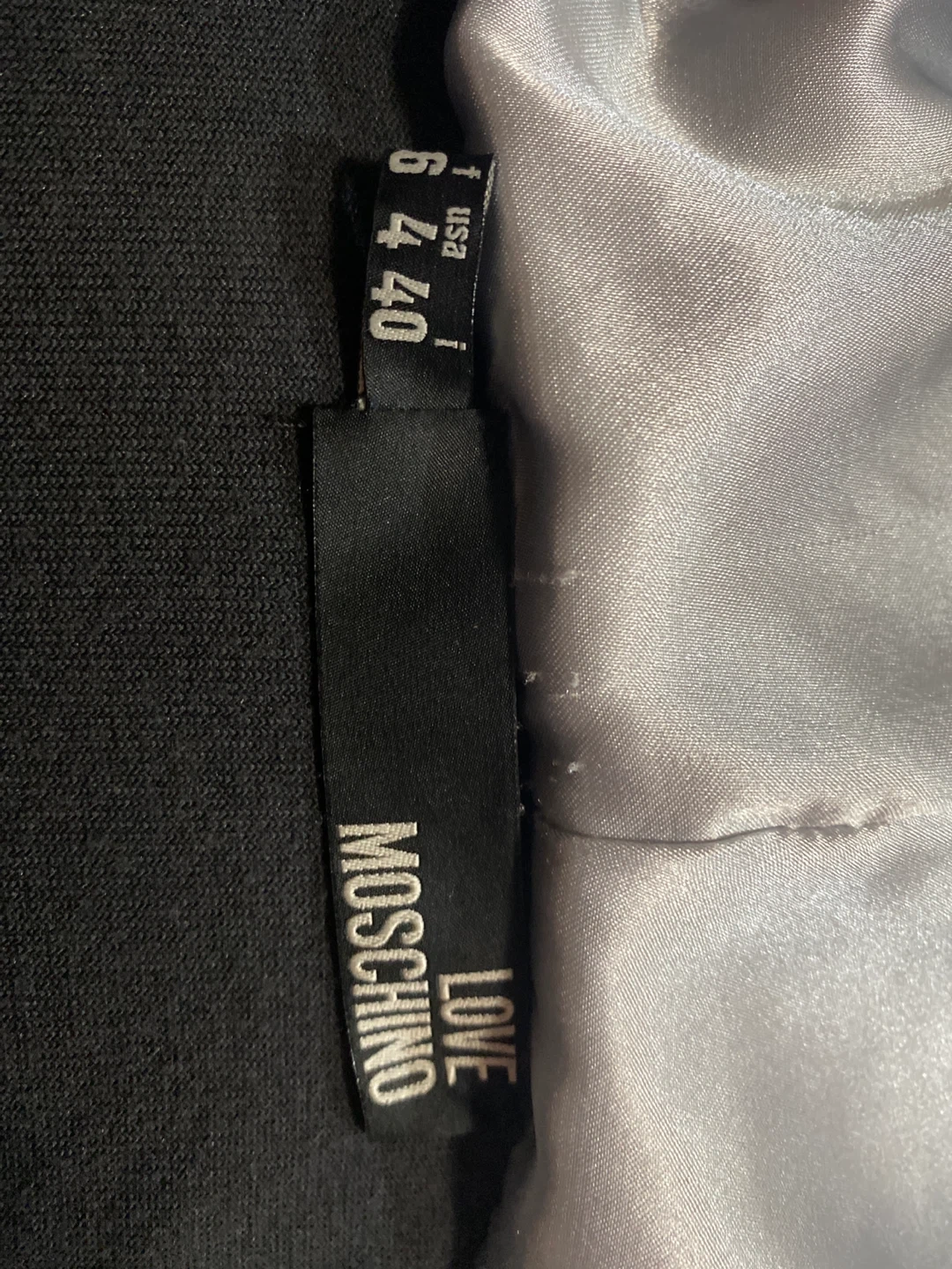 This is a Love Moschino black velvet hoodie in size 6/40. It features a zipper closure and a hood. The material is soft velvet, perfect for cooler weather