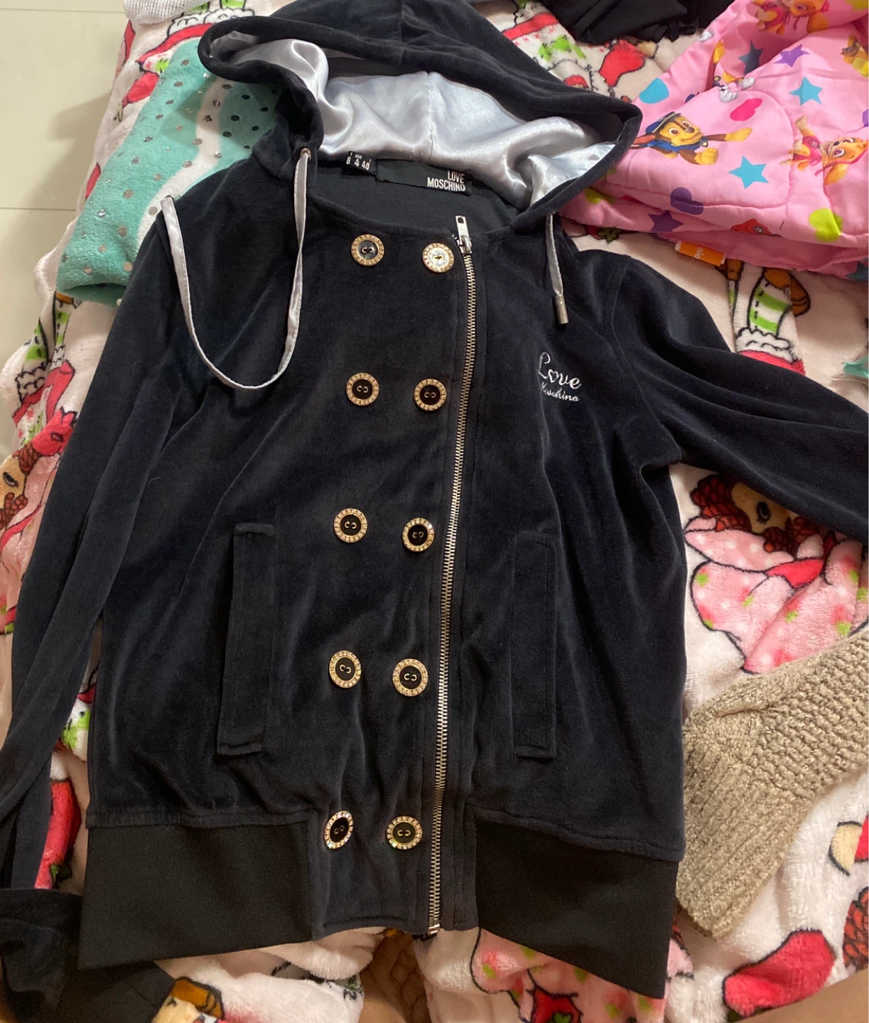 This is a Love Moschino black velvet hoodie in size 6/40. It features a zipper closure and a hood. The material is soft velvet, perfect for cooler weather