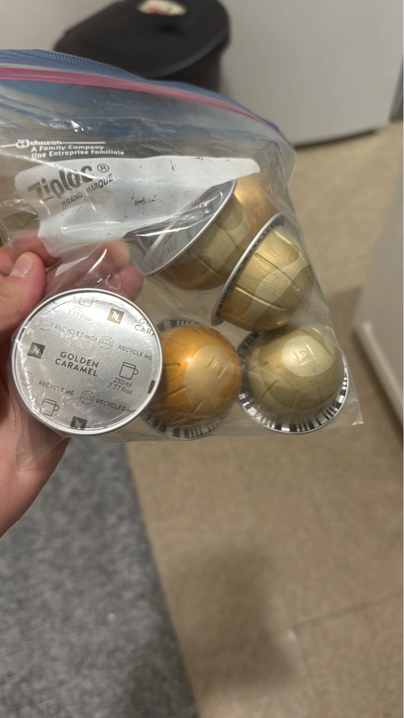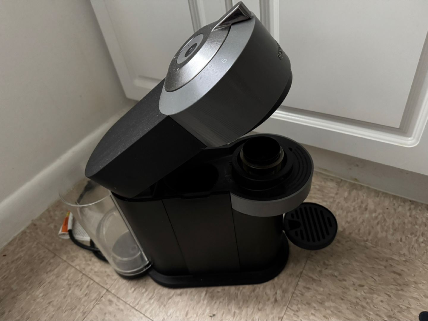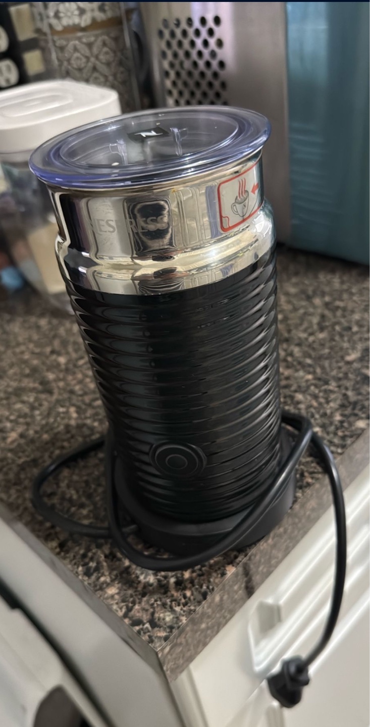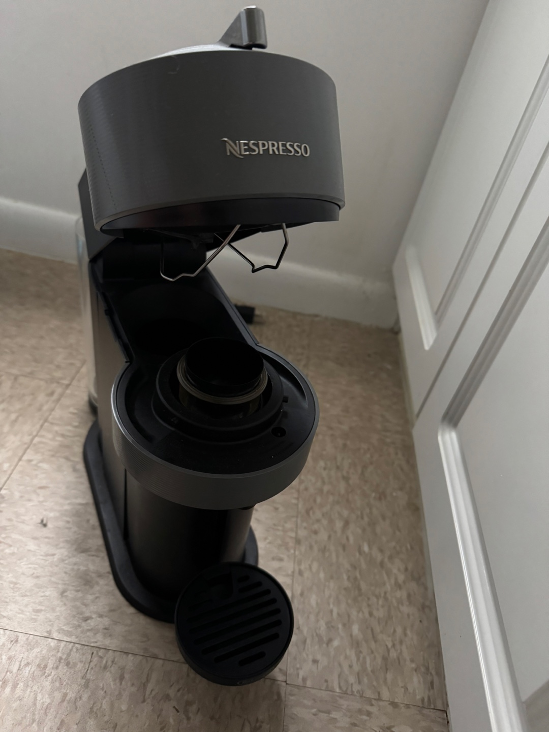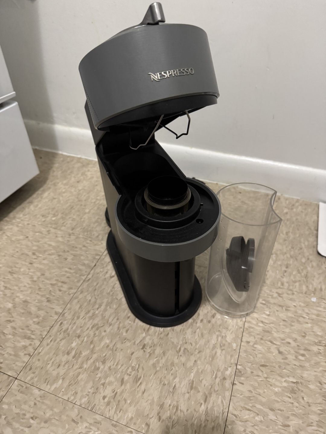 Used Nespresso Vertuo Next Coffee Maker and Espresso Machine by DeLonghi Gray. Includes milk frother. Several Golden Caramel Nespresso capsules included. Box not included.