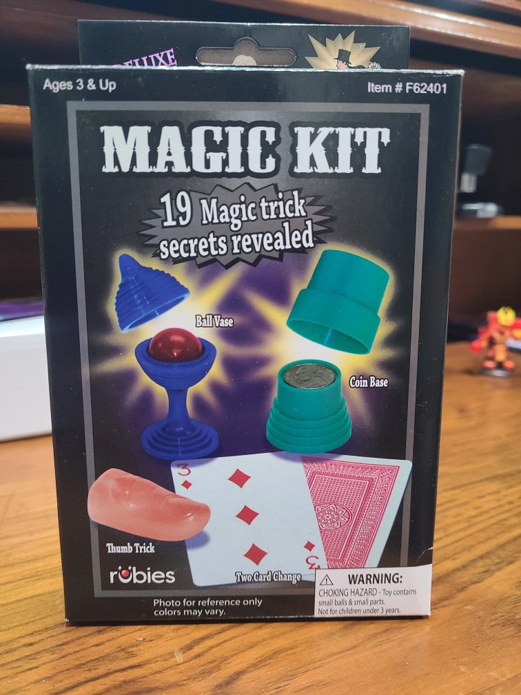 This magic kit includes 19 magic trick secrets revealed. It's recommended for ages 3 and up. Learn cool illusions like the Ball Vase, Thumb Trick, and Two Card Change!