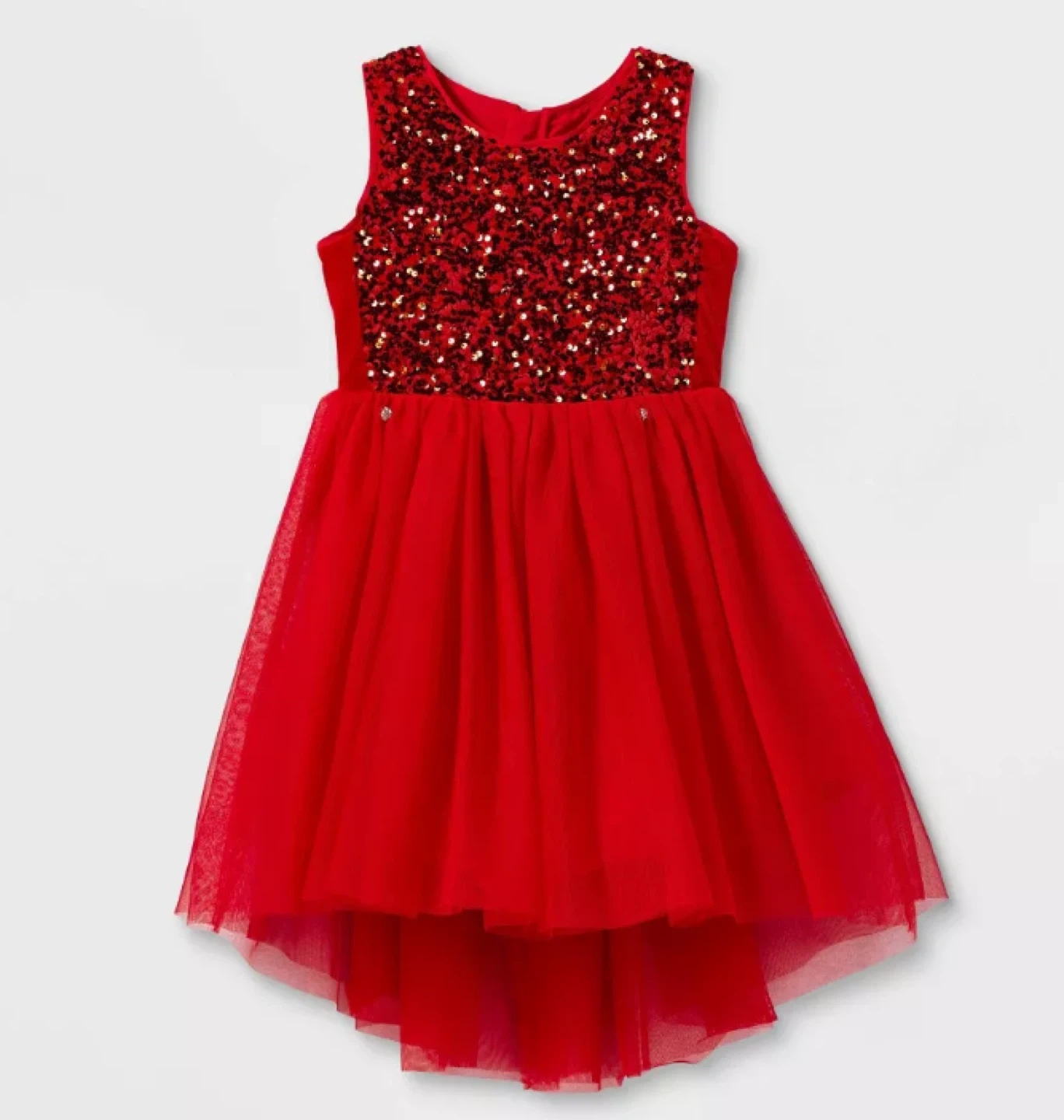 A beautiful red dress with sequin detailing on the bodice. It has a high-low hemline, perfect for a special occasion.