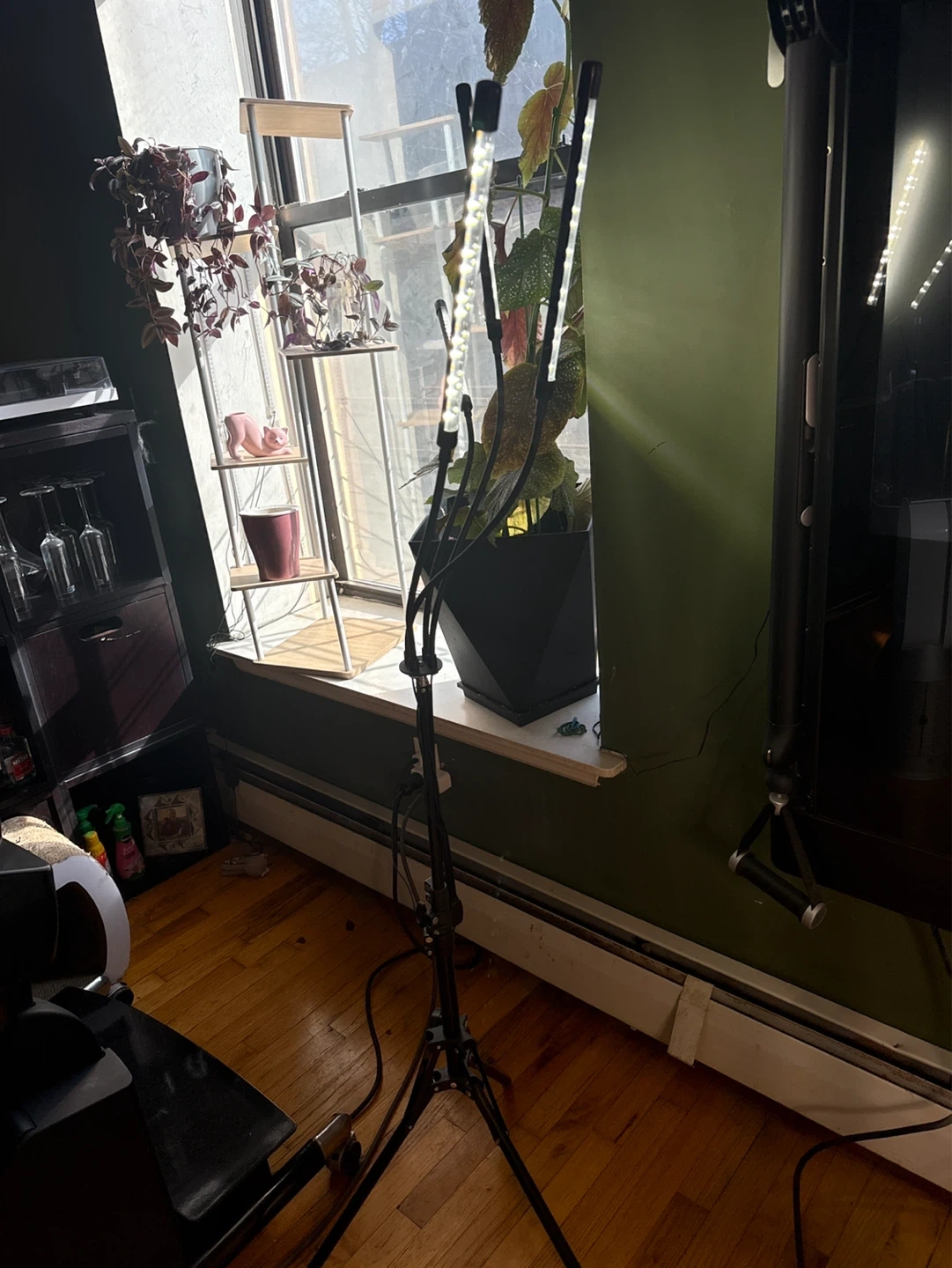 This is a grow light stand with three adjustable LED light bars. The stand has a flexible gooseneck design to position the lights. It's suitable for indoor plants that need supplemental lighting. Extends to 5 feet.