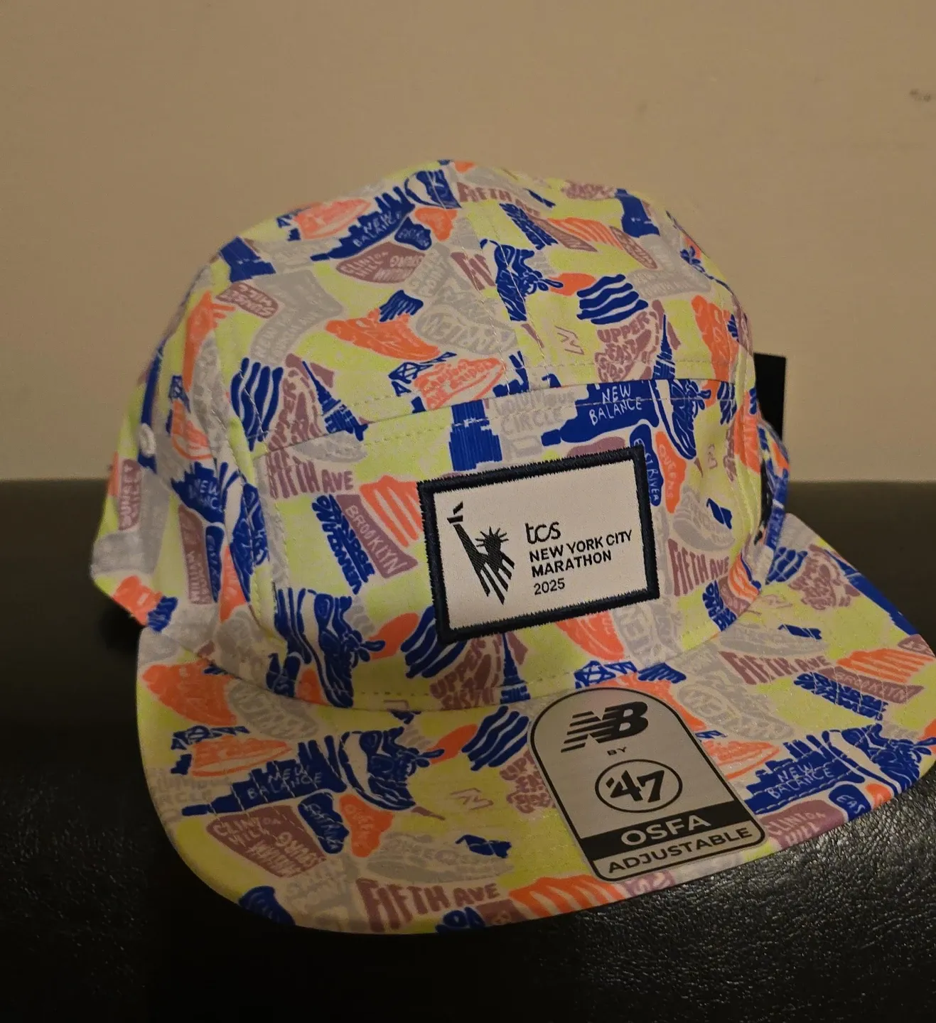 TCS New York City Marathon 2025 New Balance hat! It features a cool design with various NYC landmarks and street names. The hat is adjustable, so it's one size fits all (OSFA).
