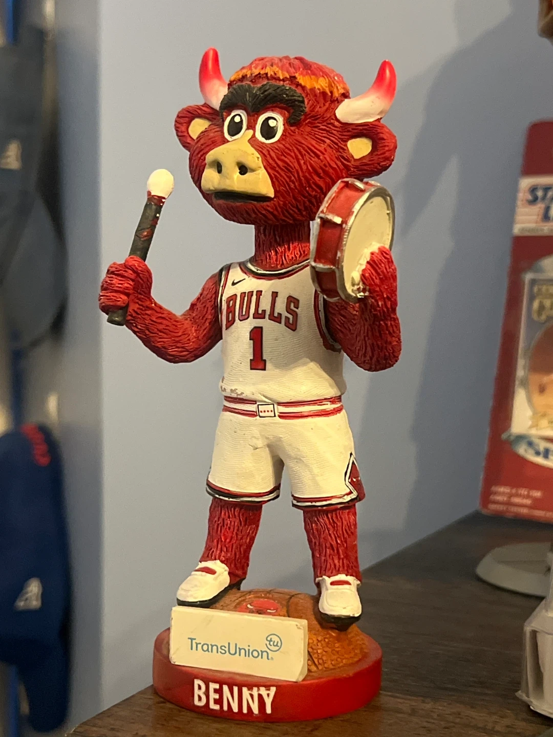 Selling a Chicago Bulls Benny the Bull bobblehead figurine! It features Benny in his Bulls uniform with a drum and drumstick. The base has the TransUnion logo and "Benny" written on it. A fun collectible for any Bulls fan!