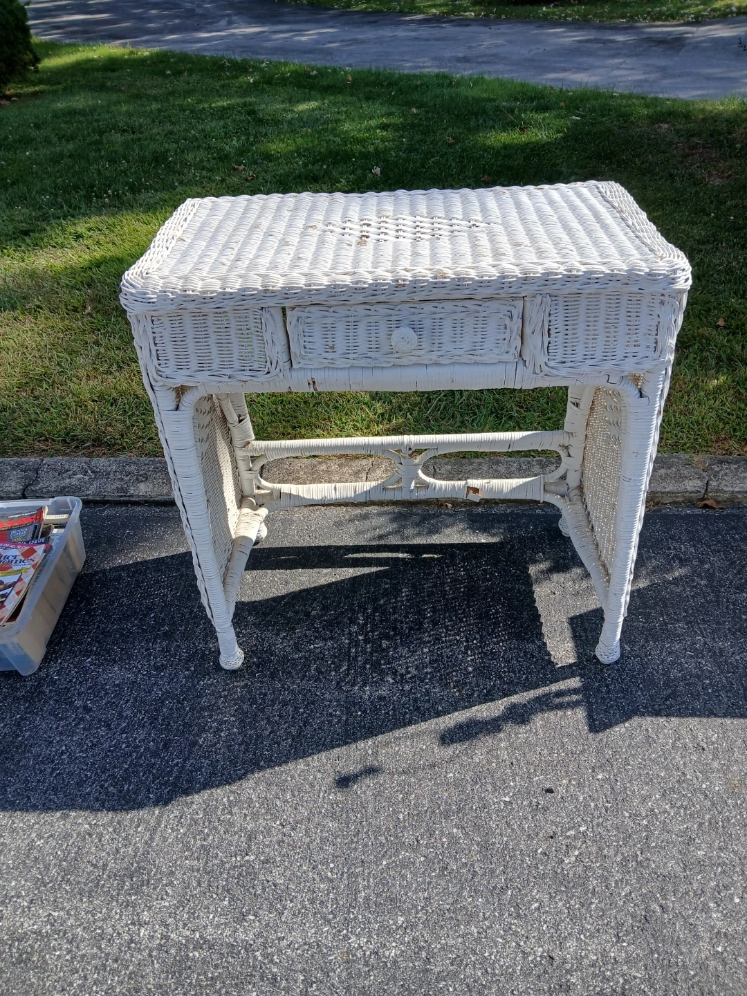 Selling a cute white wicker desk/vanity! It has a drawer for storage. It's in good condition and would be perfect for a small space