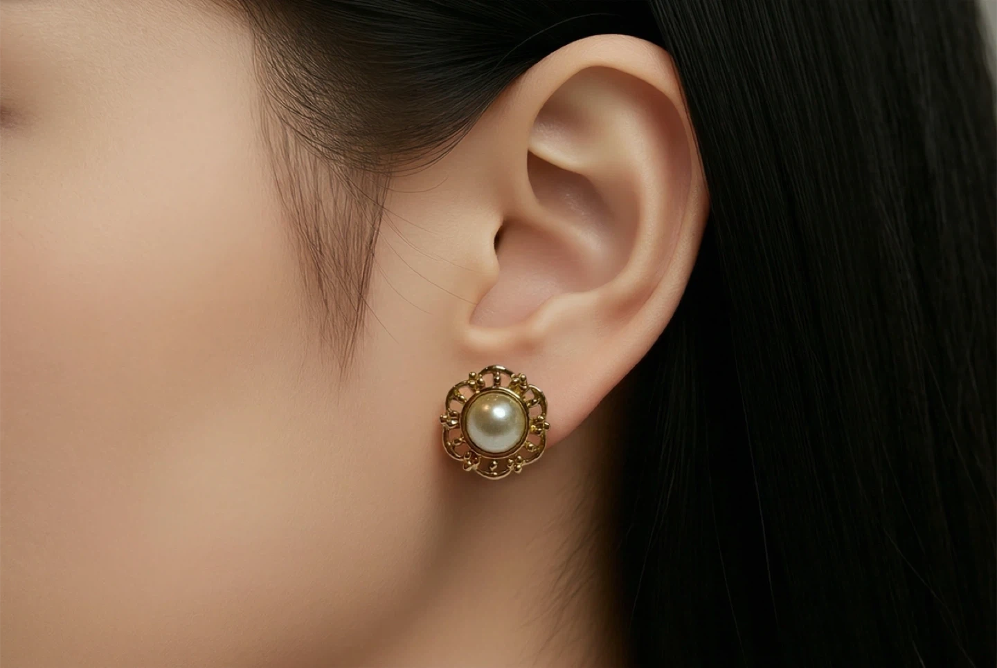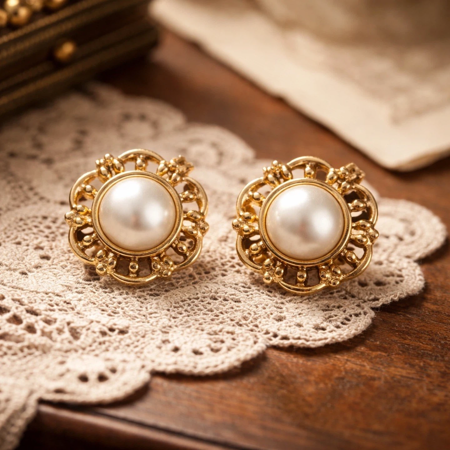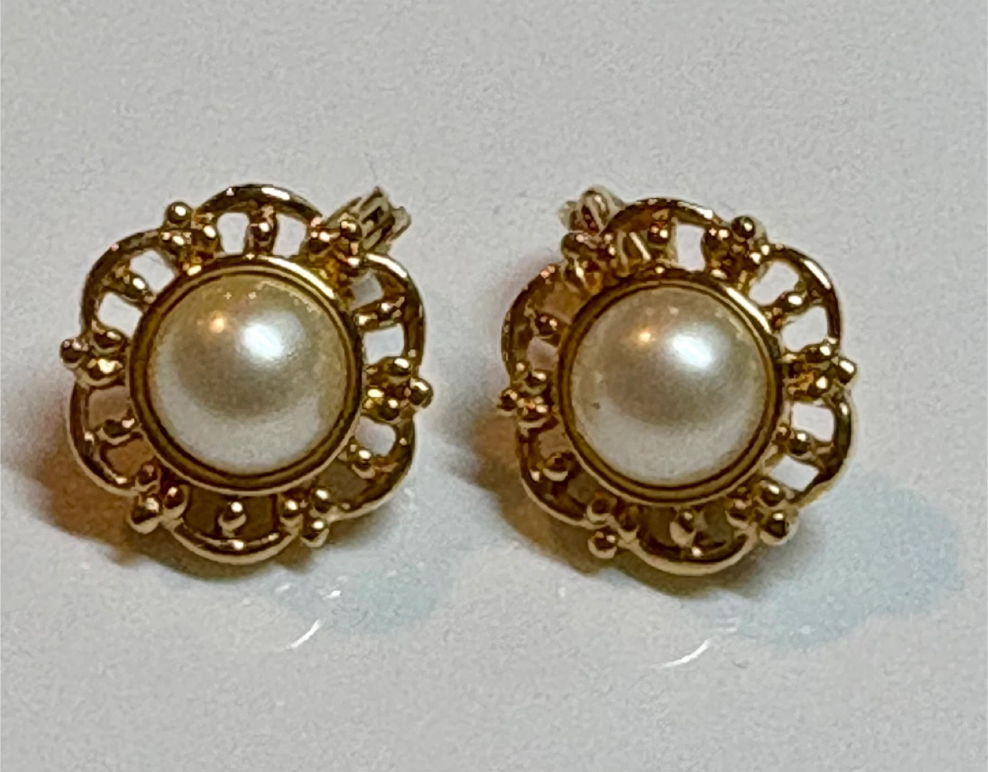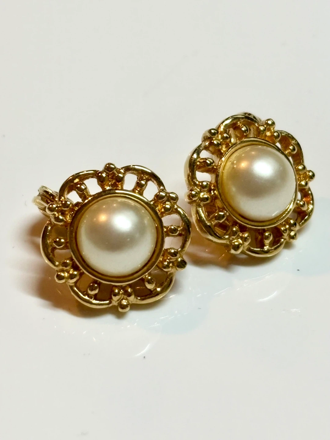Classic Monet clip-on earrings featuring a gold-tone floral design with a faux pearl center. These earrings have secure clip-on backs. They're a lovely accessory for adding a touch of vintage charm to any outfit!