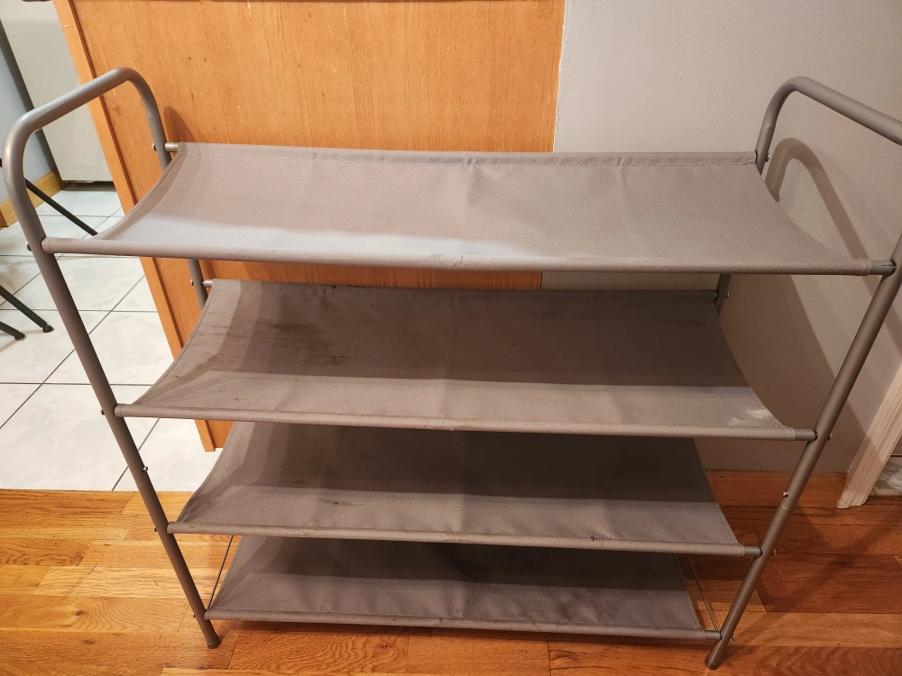 Selling a handy 4-tier shoe rack! It's perfect for keeping your entryway or closet organized. There are a few spots on the fabric, but it's still in good condition and ready to use