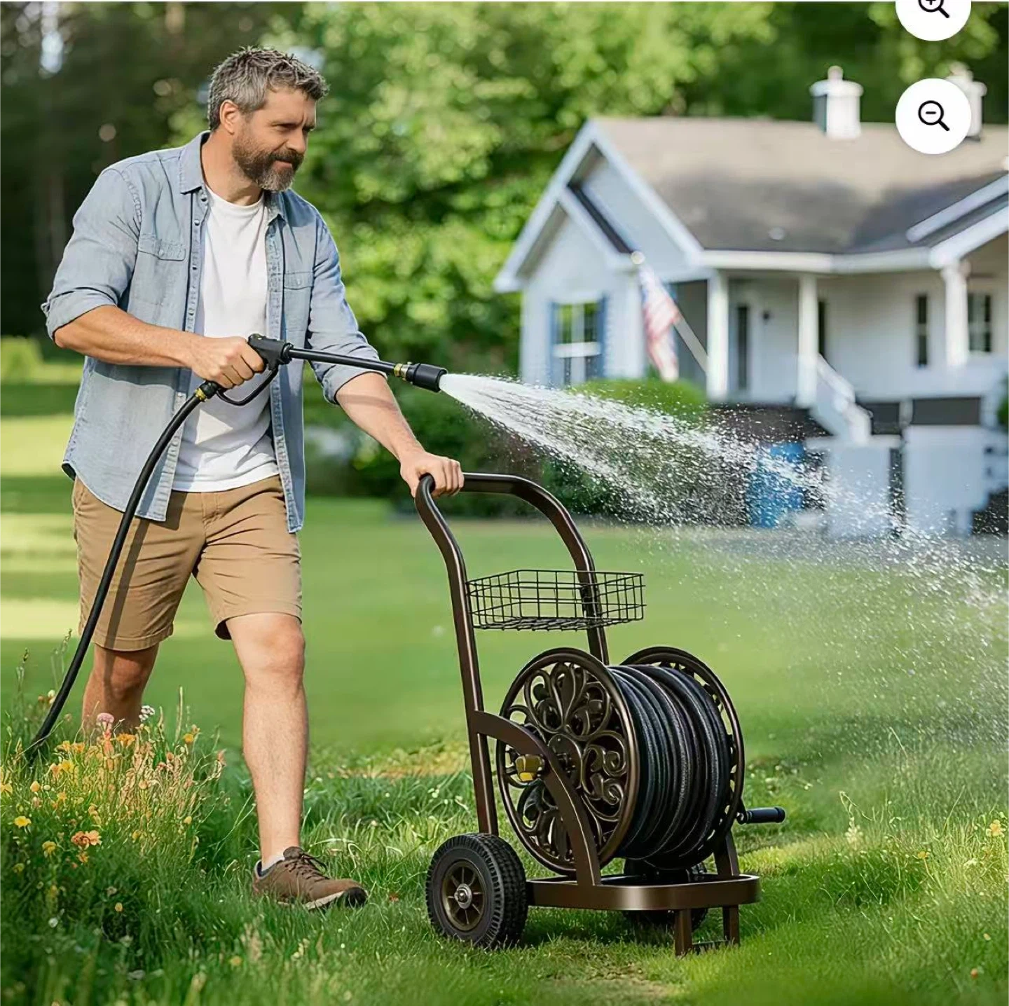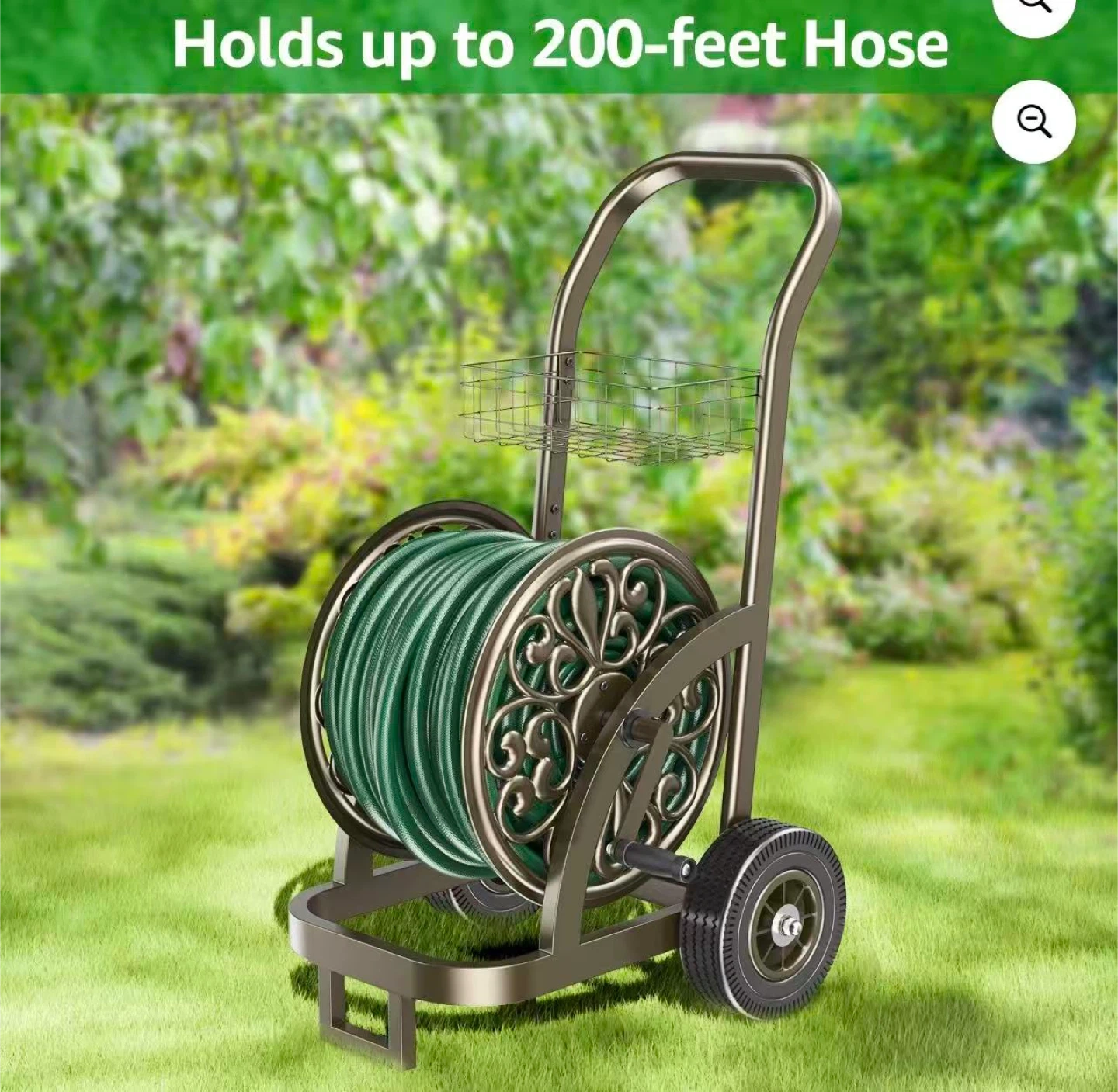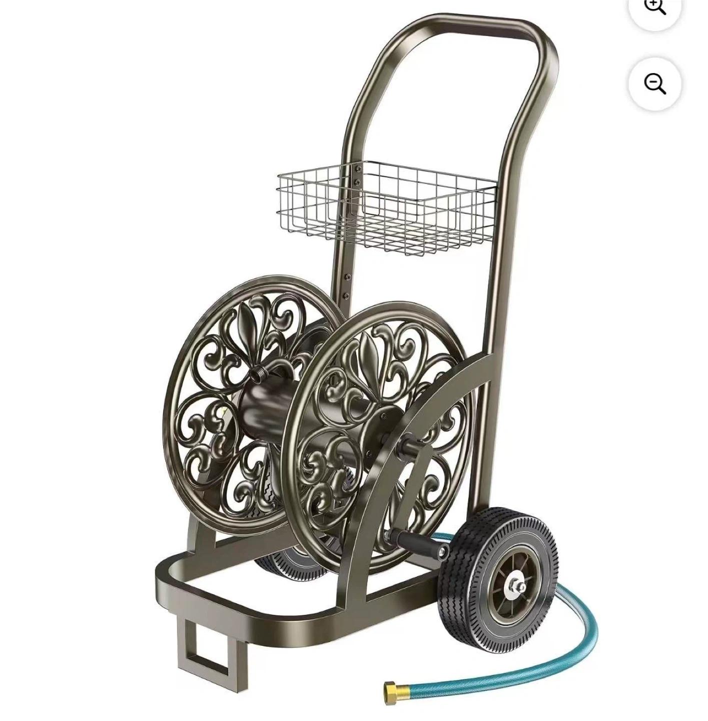 Decorative Garden Hose Reel Cart with Storage Basket