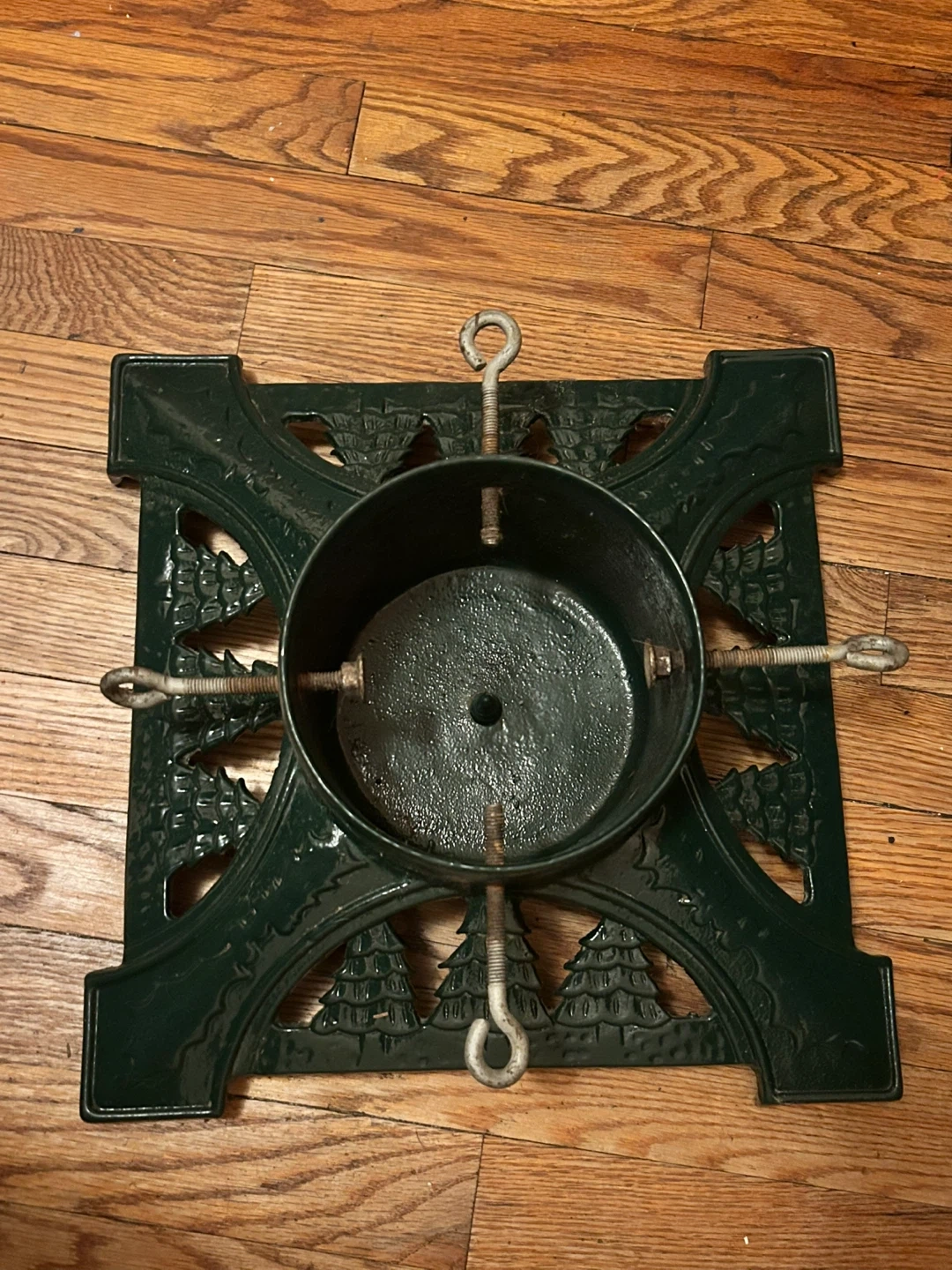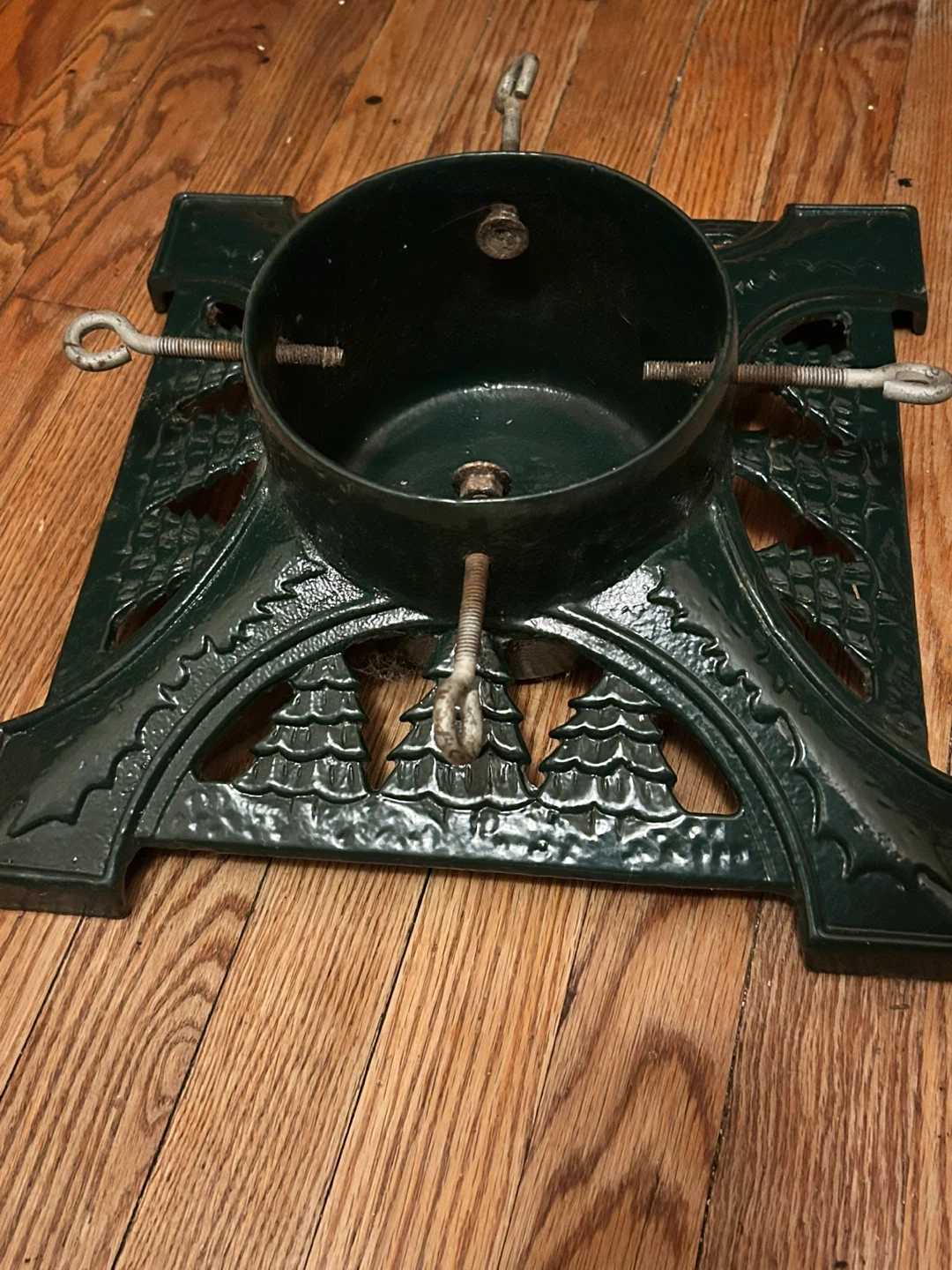 Heavy duty green metal Christmas tree stand. Features an ornate design with embossed trees. Includes 4 adjustable screws to secure the tree trunk. Sturdy construction for stability.