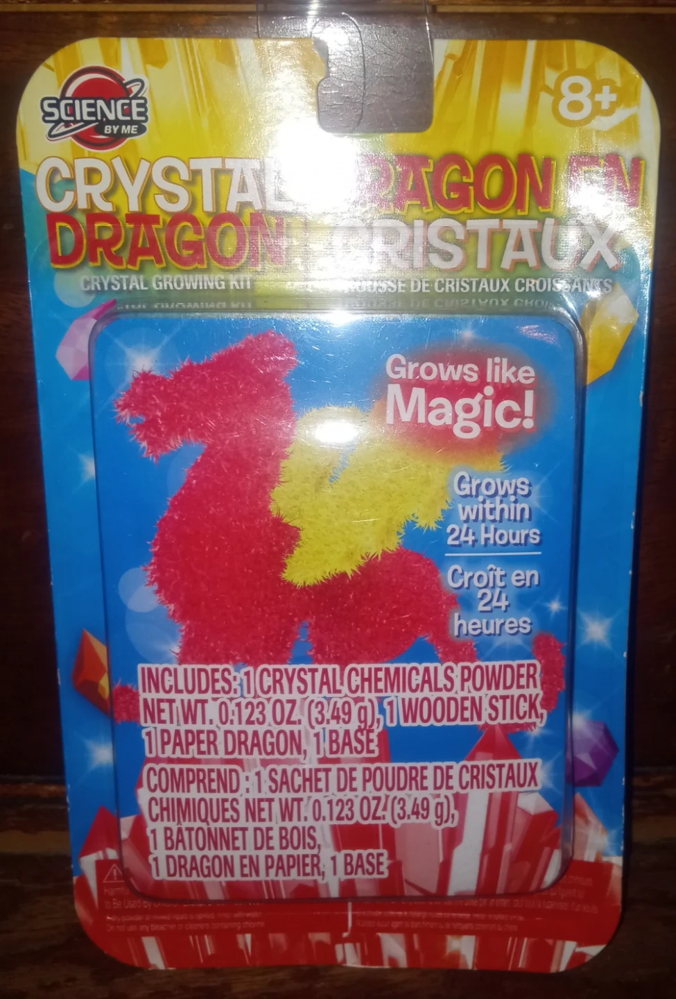 This is a crystal growing kit featuring a dragon. It includes 1 crystal chemicals powder (0.123 oz / 3.49g), 1 wooden stick, 1 paper dragon, and 1 base. Crystals grow within 24 hours! This kit is recommended for ages 8+.