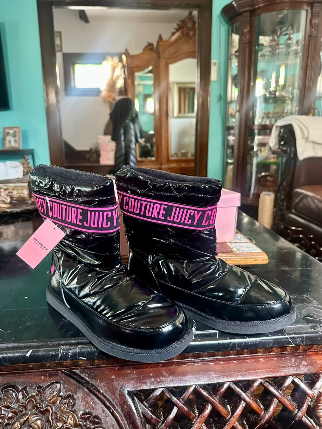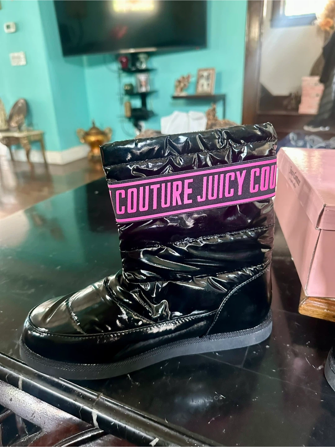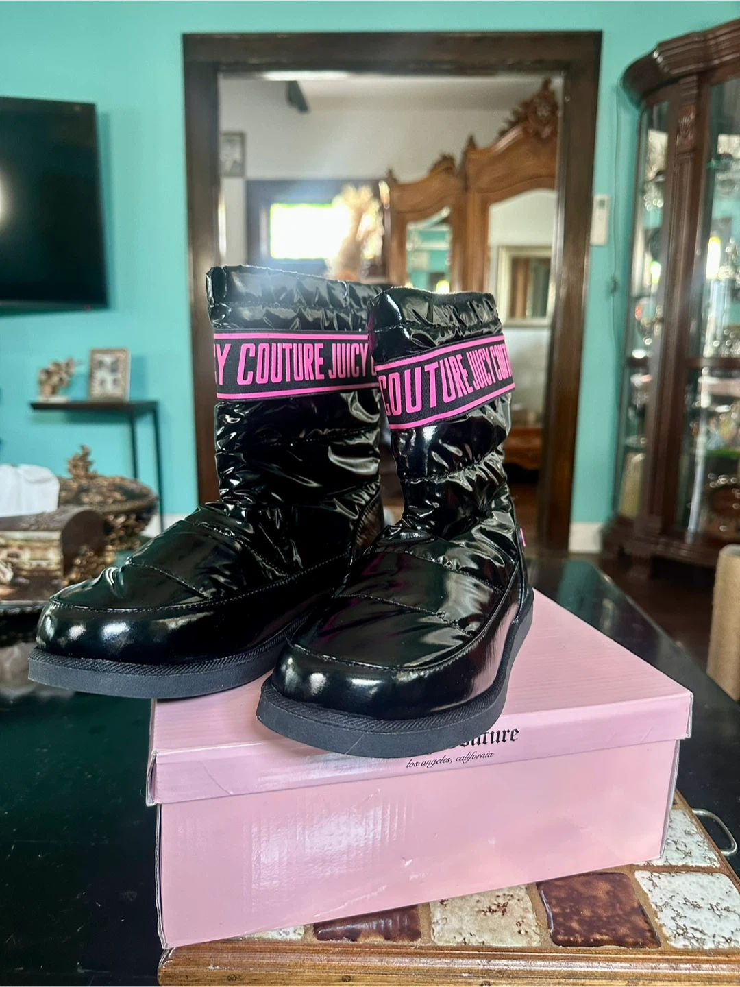 These Juicy Couture snow boots are super cute and stylish! They are black puffer style with the Juicy Couture logo in pink around the top. They come with the original box