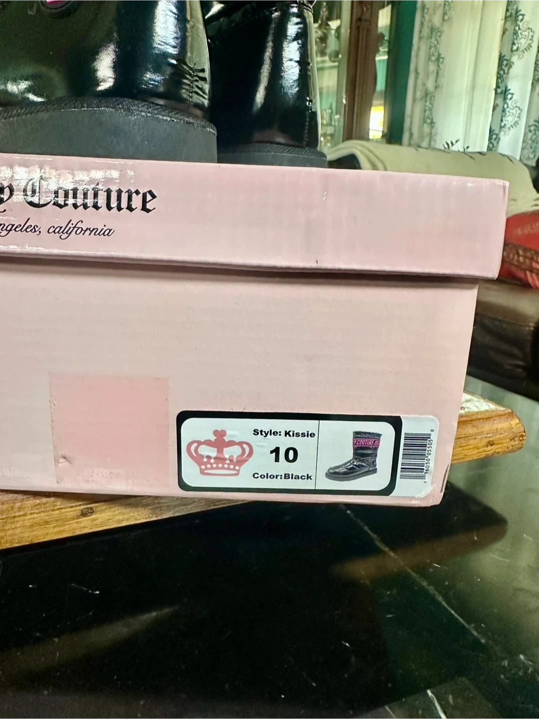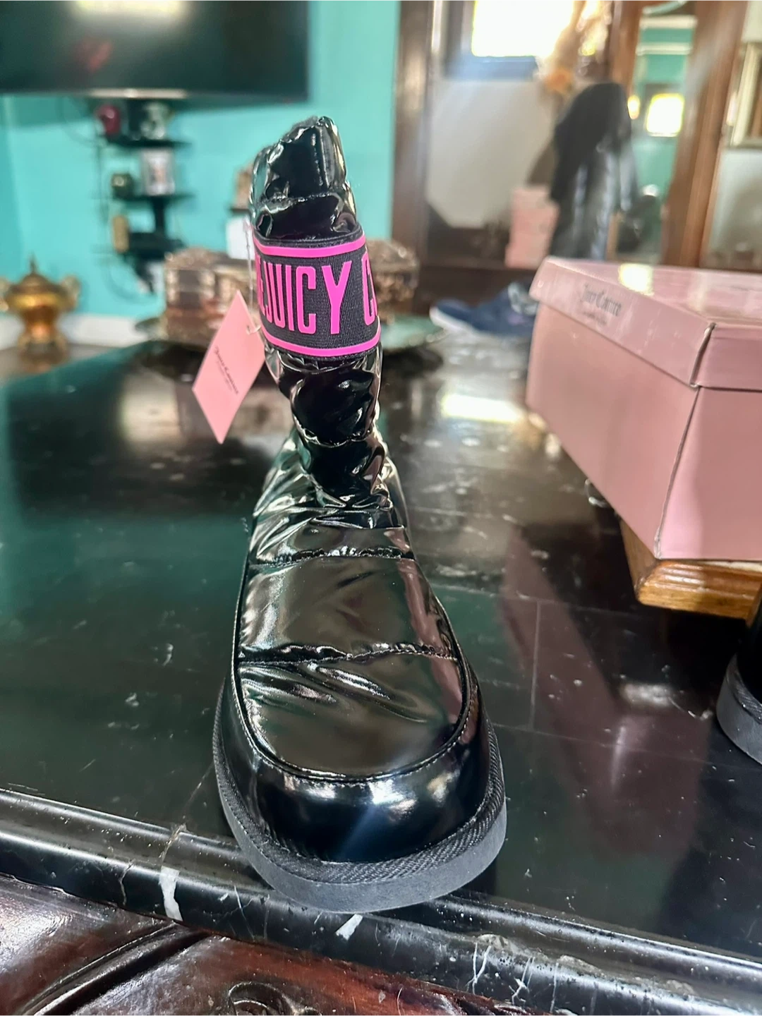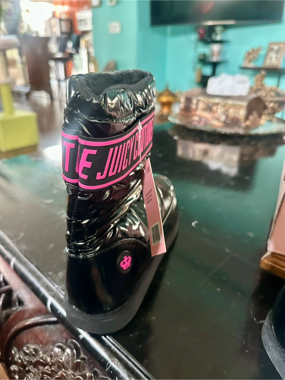 These Juicy Couture snow boots are super cute and stylish! They are black puffer style with the Juicy Couture logo in pink around the top. They come with the original box