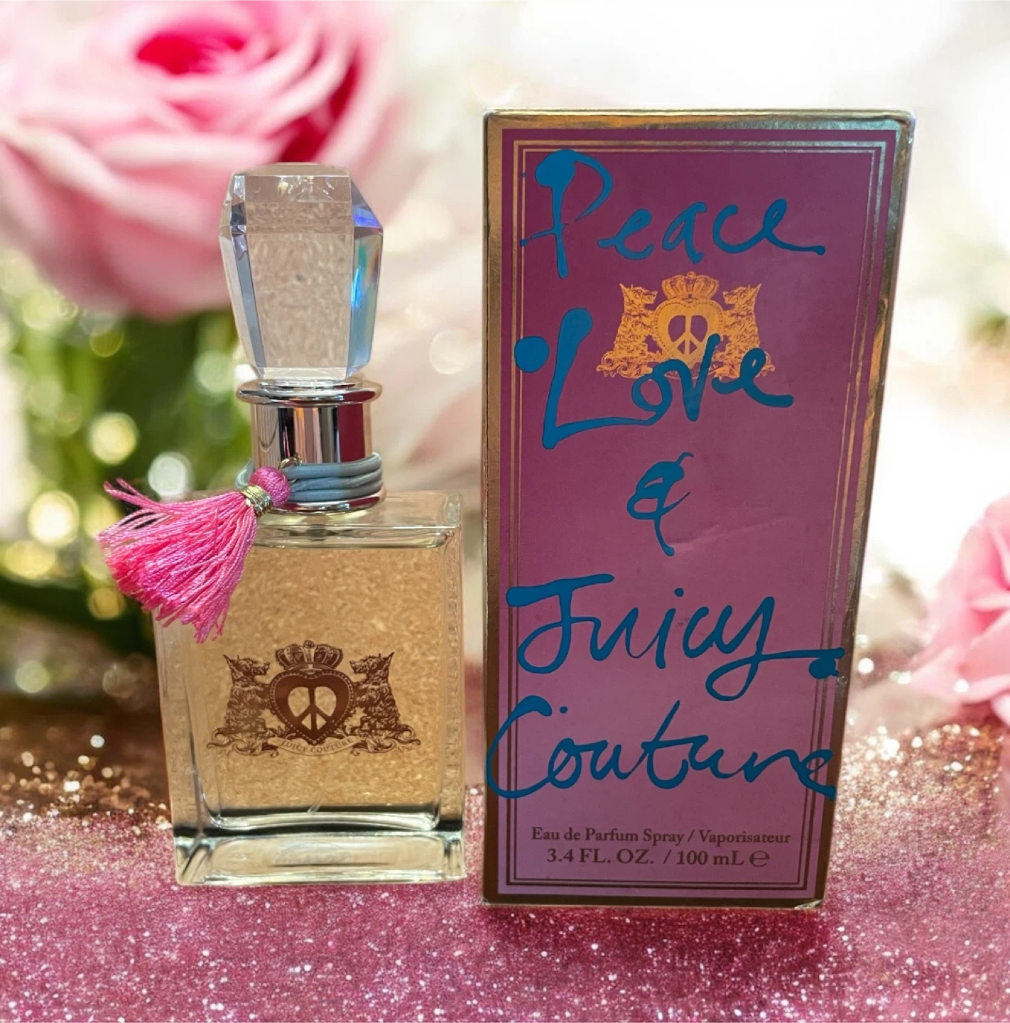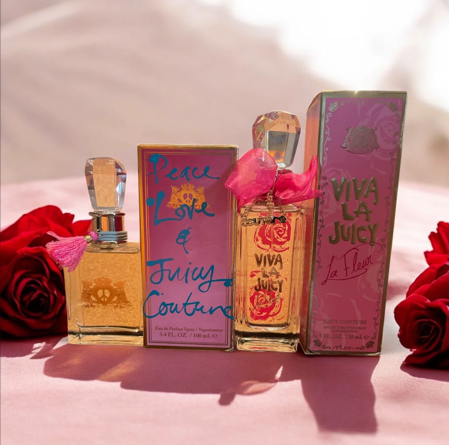232 bottles of two different fragrances from the Juicy Couture brand: Peace, Love & Juicy Couture 3.4 oz and Viva La Juicy La Fleur 5. oz. Viva La Juicy La Fleur. *Here is information regarding the Viva La Juicy La Fleur fragrance: *Scent Profile: sparkling mandarin and wild berries, a floral heart of honeysuckle, gardenia, and jasmine. *Availability: It is available in 5 oz sprays. *Product Type: The product shown is an Eau de Toilette (EDT) spray for women. Peace, Love & Juicy Couture *Here is information regarding the Peace, Love & Juicy Couture. *Scent Profile: It is a vibrant, floral-fruity aroma that blends freshly cut blossoms, natural accents, and wood harmonies. *Availability: It is available in 3.4 oz sprays. *Product Type: The product shown is an Eau de Toilette (EDT) spray for women.