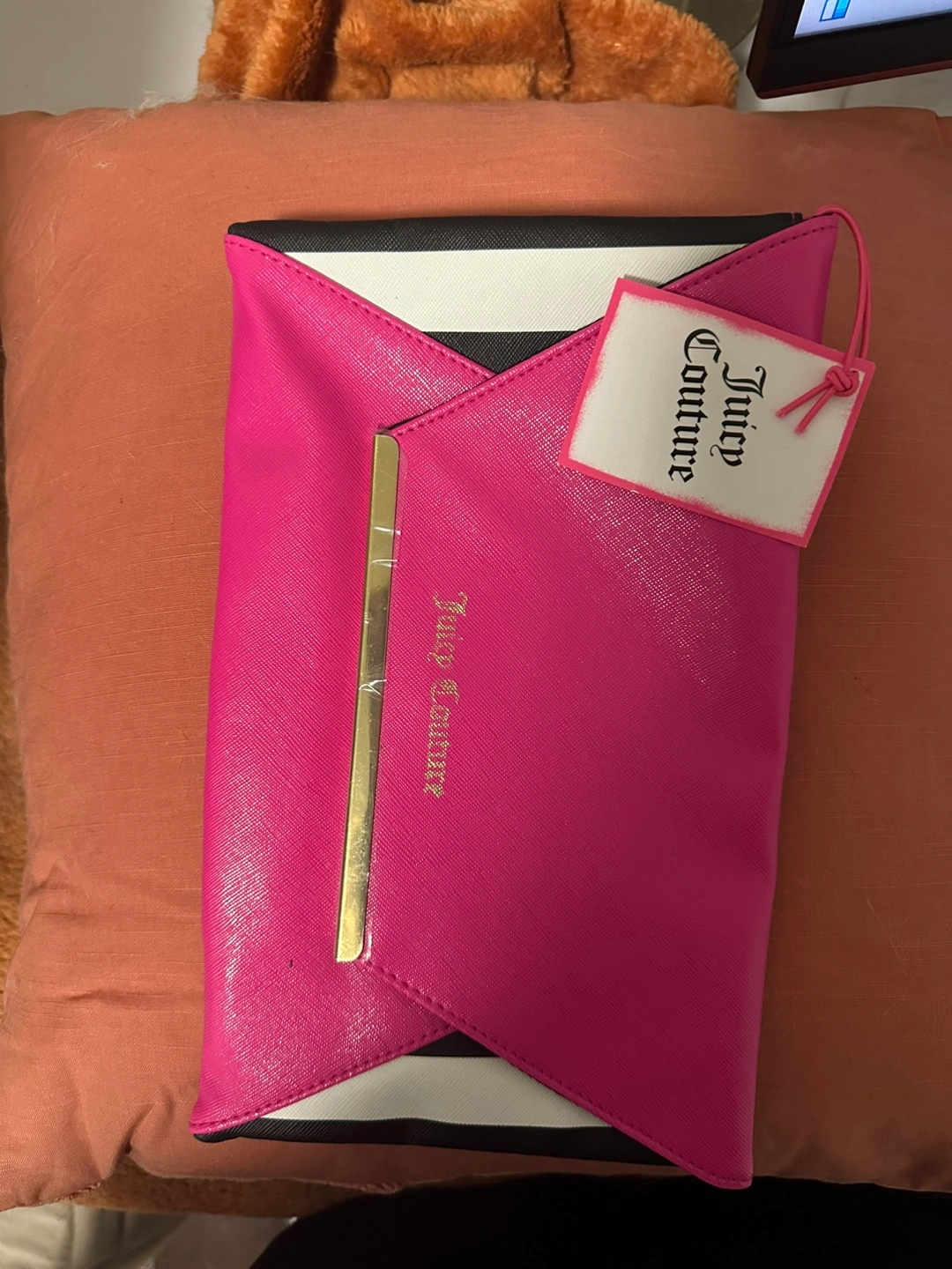 Selling a cute Juicy Couture clutch! It's in great condition and features a vibrant pink exterior with black and white striped accents. Perfect for adding a pop of color to any outfit!