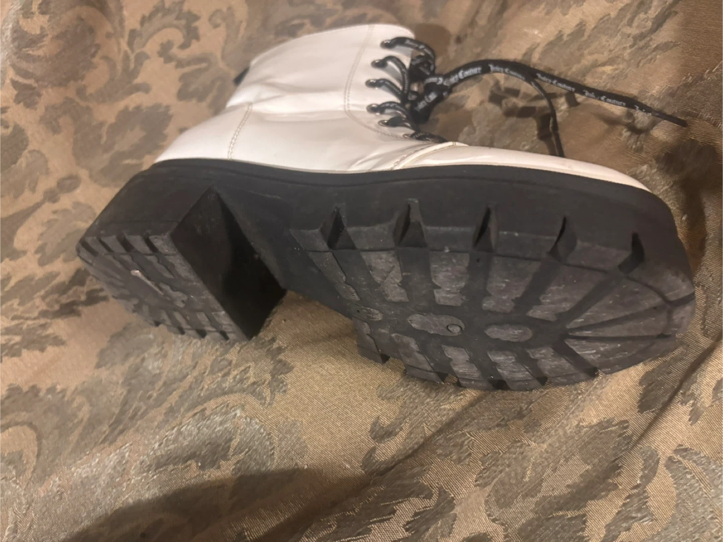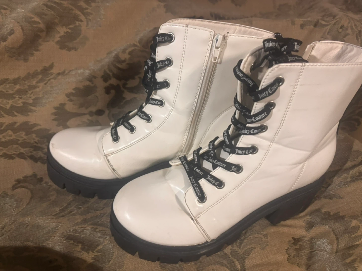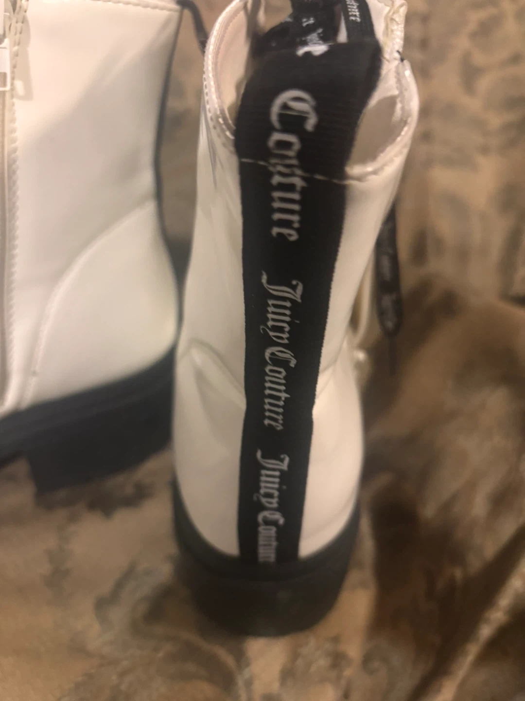 18These are a pair of white Juicy Couture boots with black laces! They have a lace-up design with the brand name on the laces. They appear to be in good condition and ready for a new home