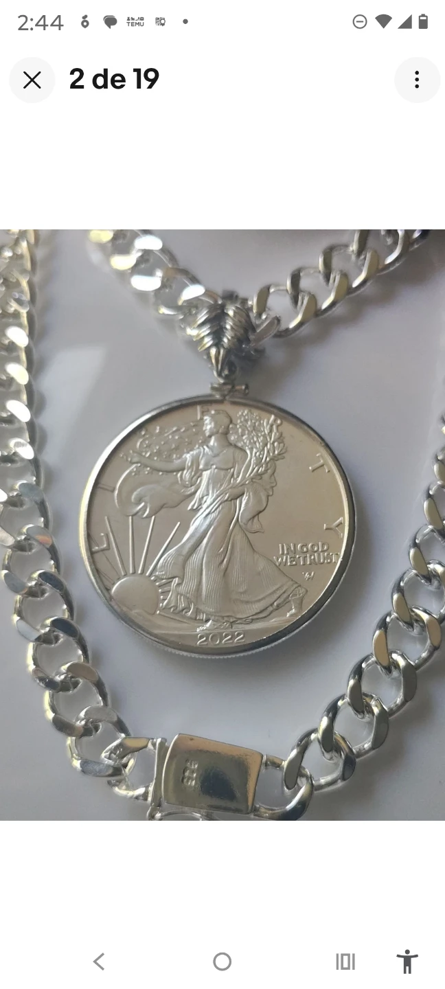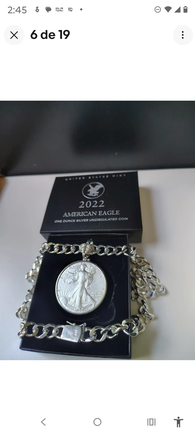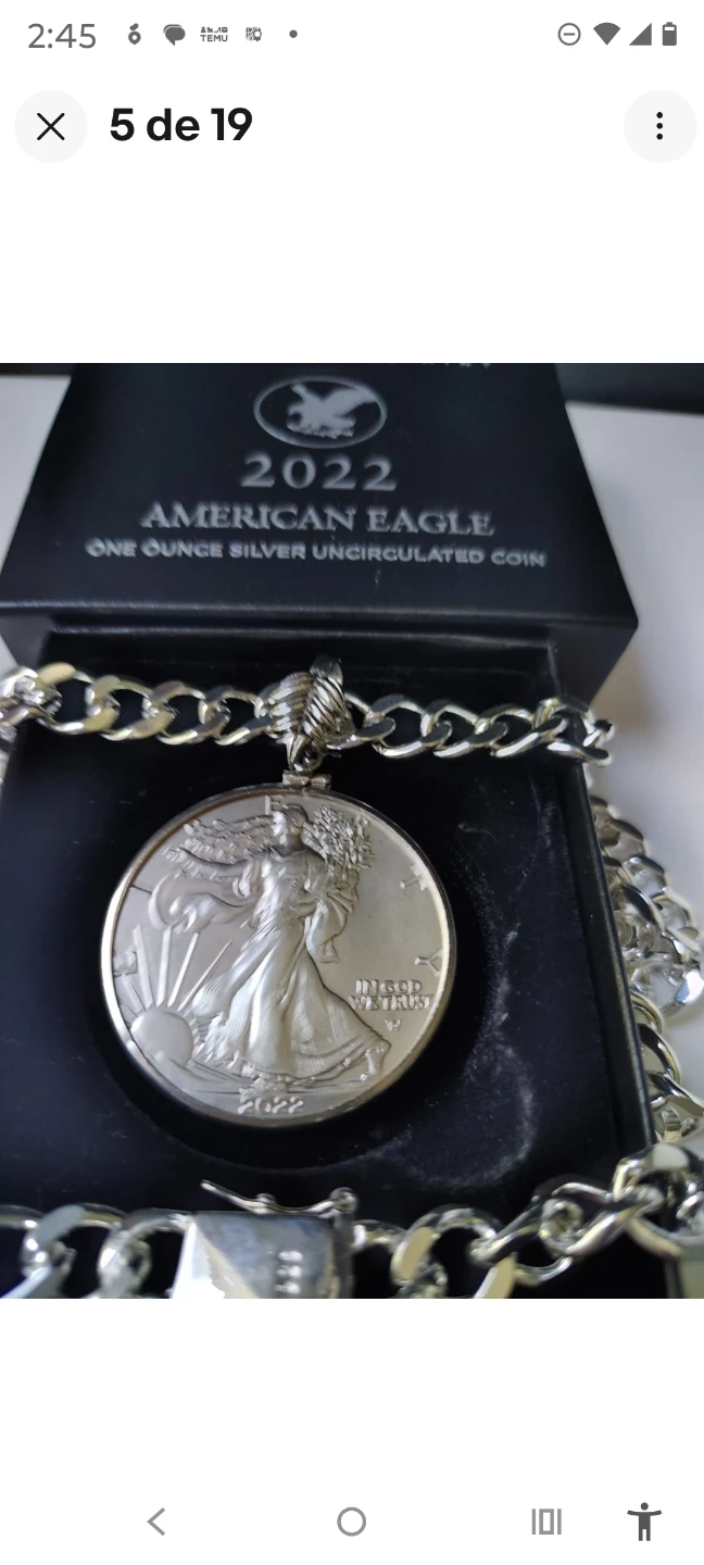This necklace features a 2022 American Eagle one ounce silver uncirculated coin. The coin is set in a silver-tone chain. Comes with its original box.