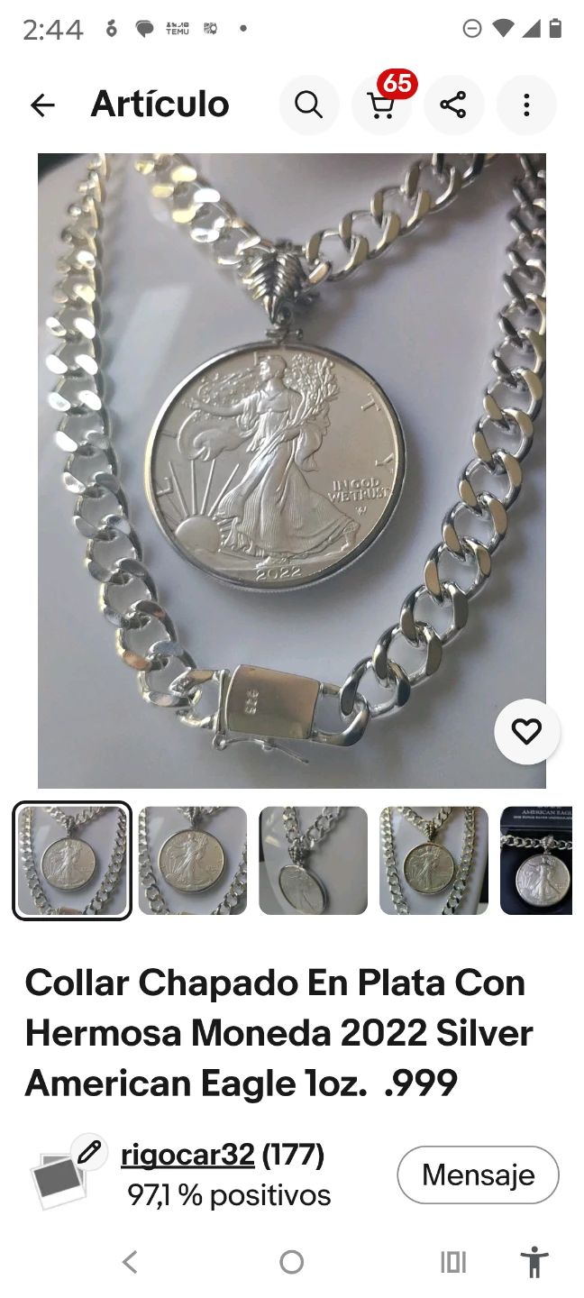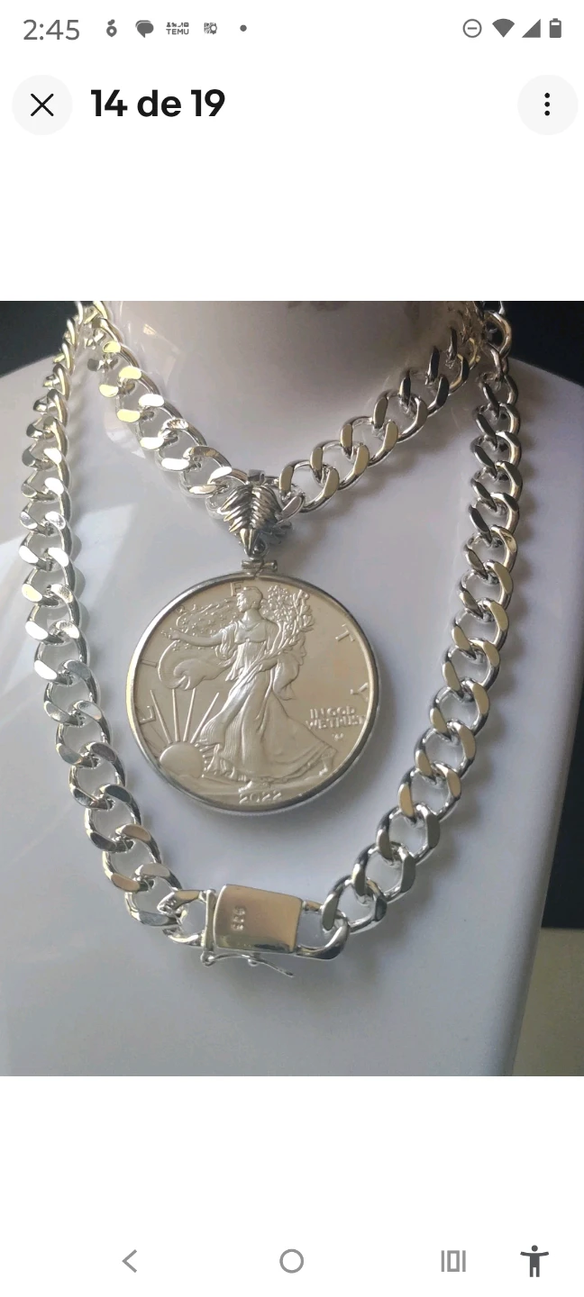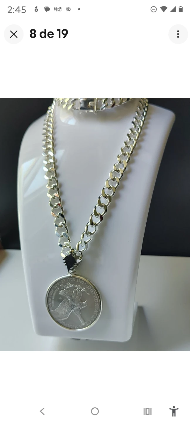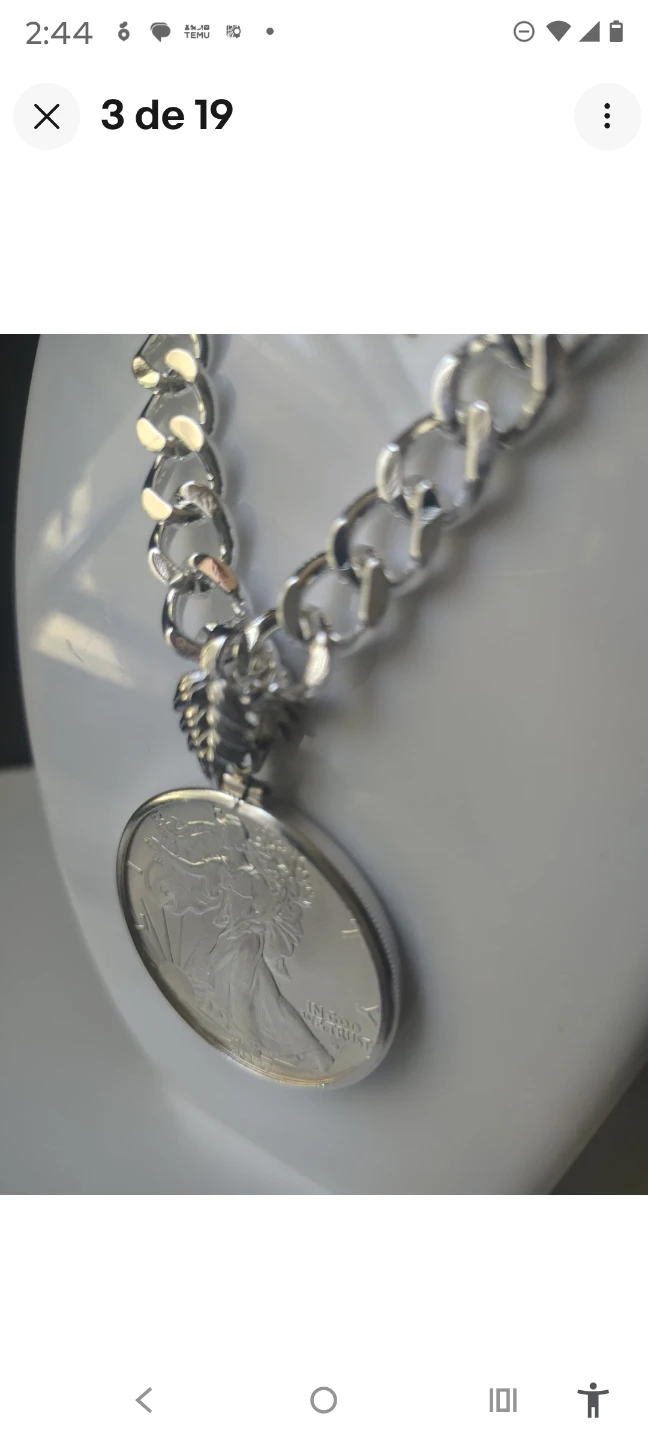 This necklace features a 2022 American Eagle one ounce silver uncirculated coin. The coin is set in a silver-tone chain. Comes with its original box.