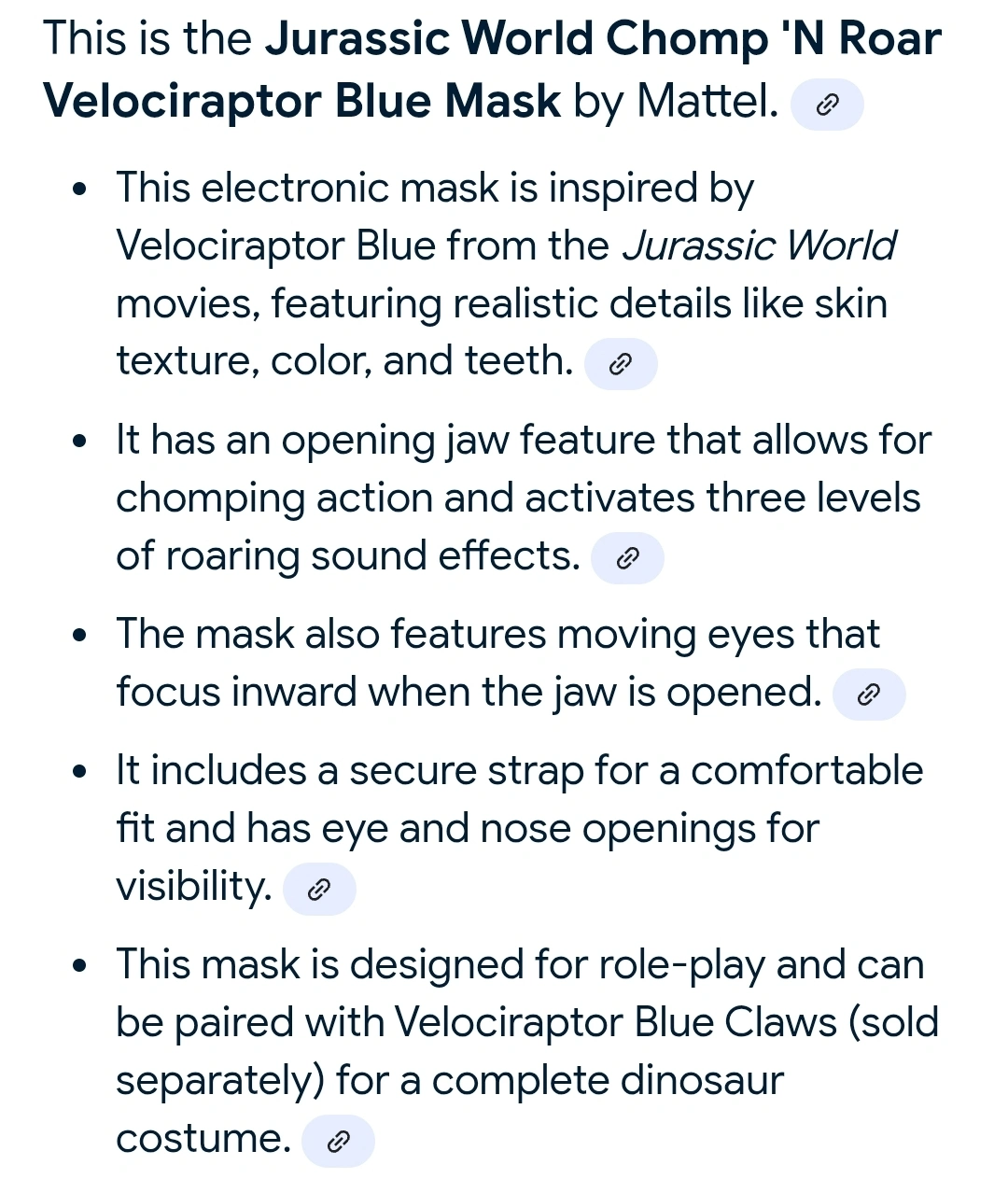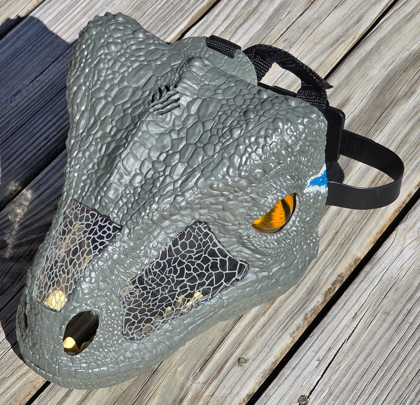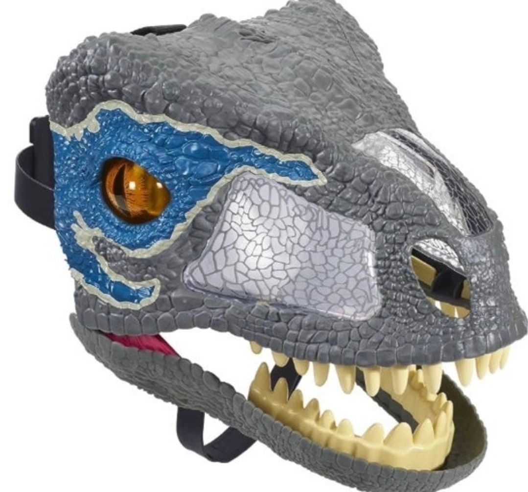 Selling a Jurassic World Chomp 'N Roar Velociraptor Blue Mask by Mattel! This electronic mask is inspired by Velociraptor Blue from the Jurassic World movies, and features realistic details like skin texture, color, and teeth. It has an opening jaw feature that allows for chomping action and activates three levels of roaring sound effects. The mask also features moving eyes that focus inward when the jaw is opened. It includes a secure strap for a comfortable fit and has eye and nose openings for visibility Pick up in Naperville near naper blvd and 87th street or near downtown Naperville off of Chicago and Charles