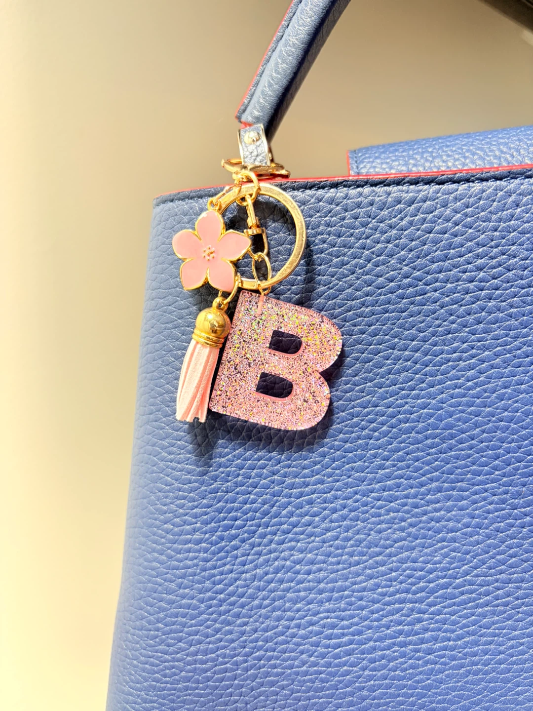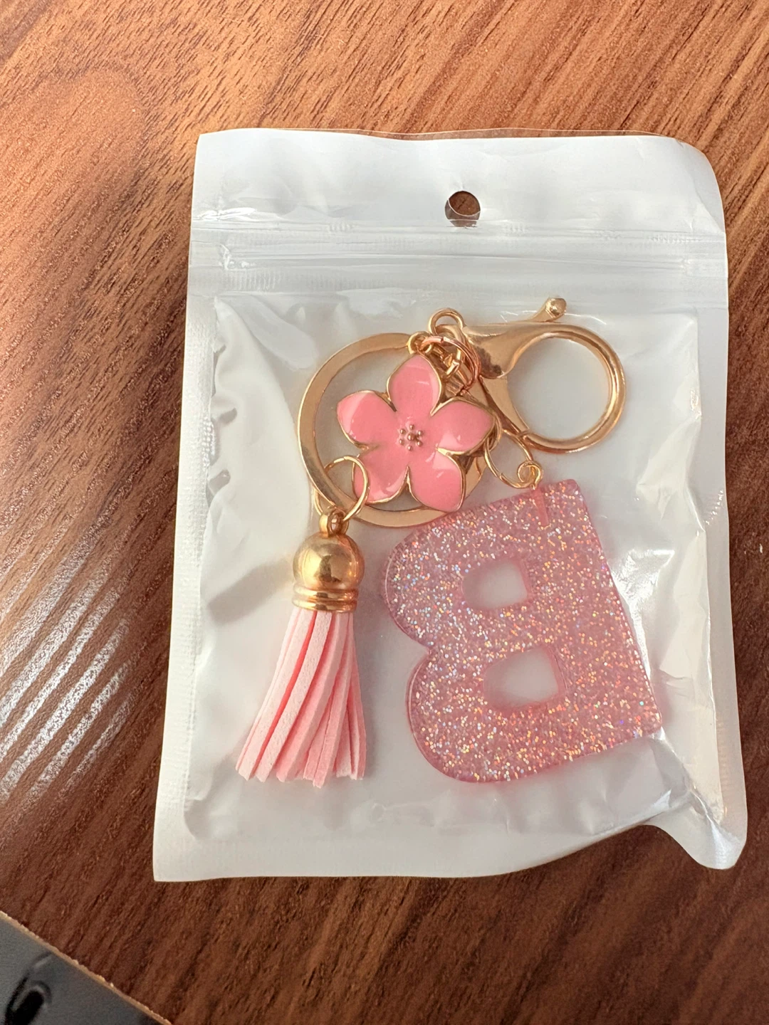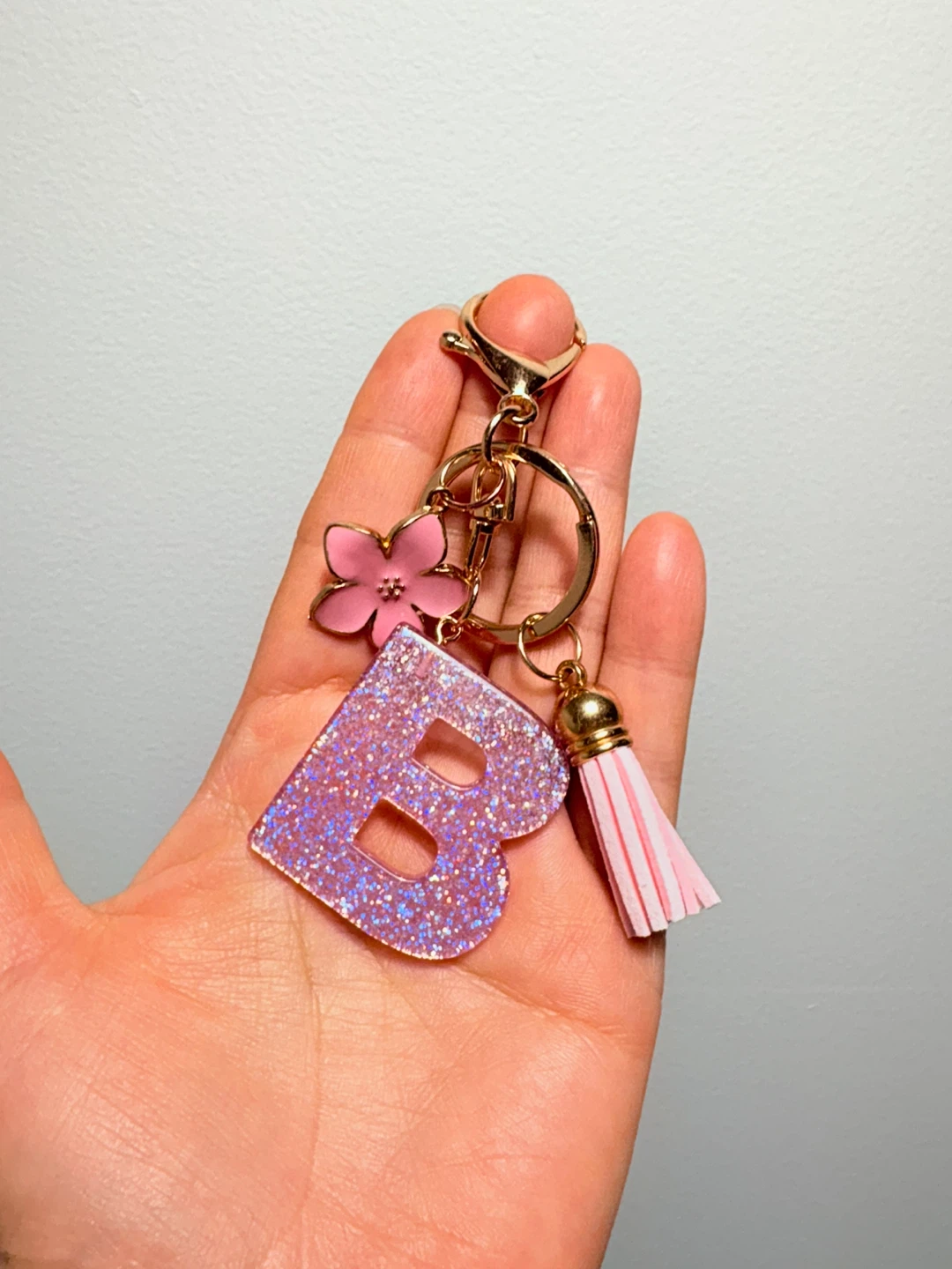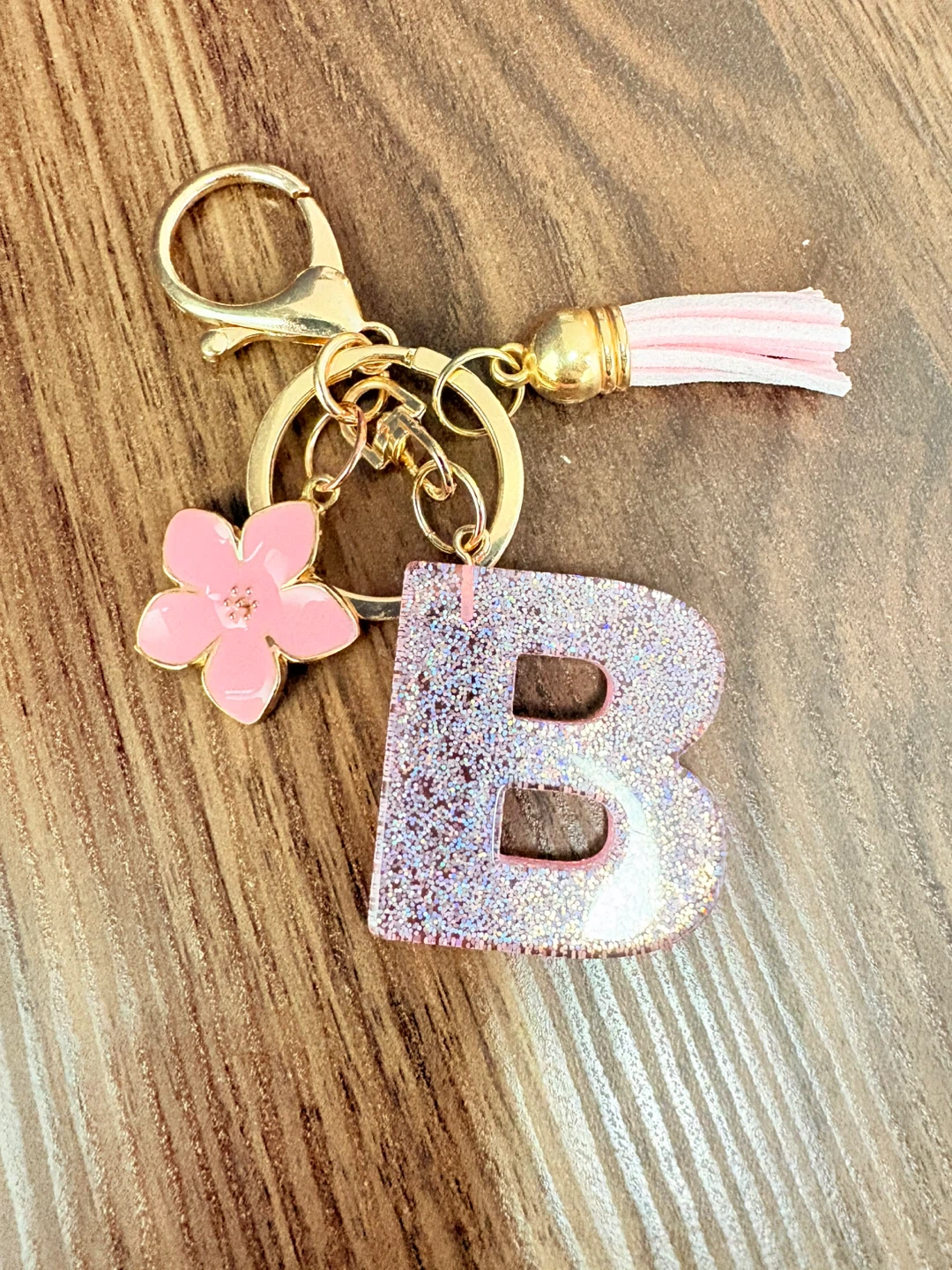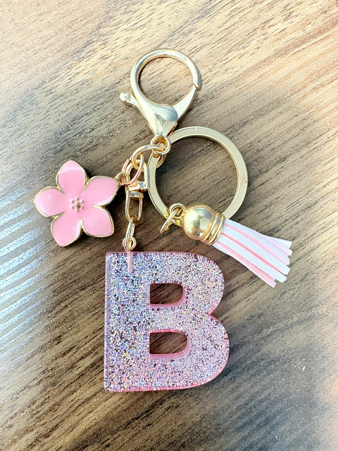 This keychain features a glitter-filled letter 'B' charm and a pink flower accent. It also includes a pink tassel and a gold-tone clasp. It's perfect for personalizing bags or keys!