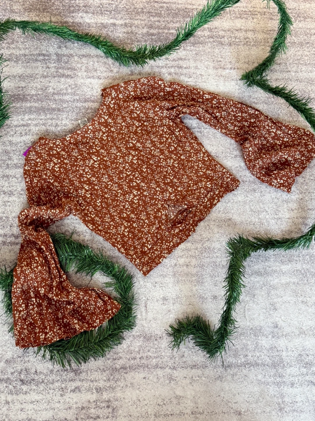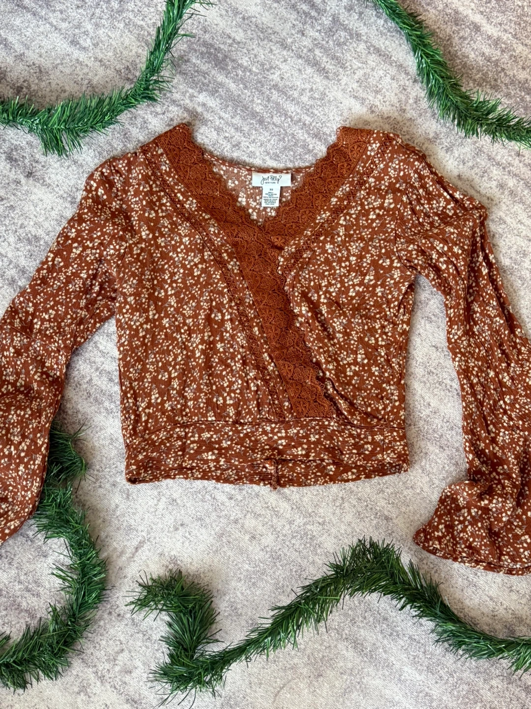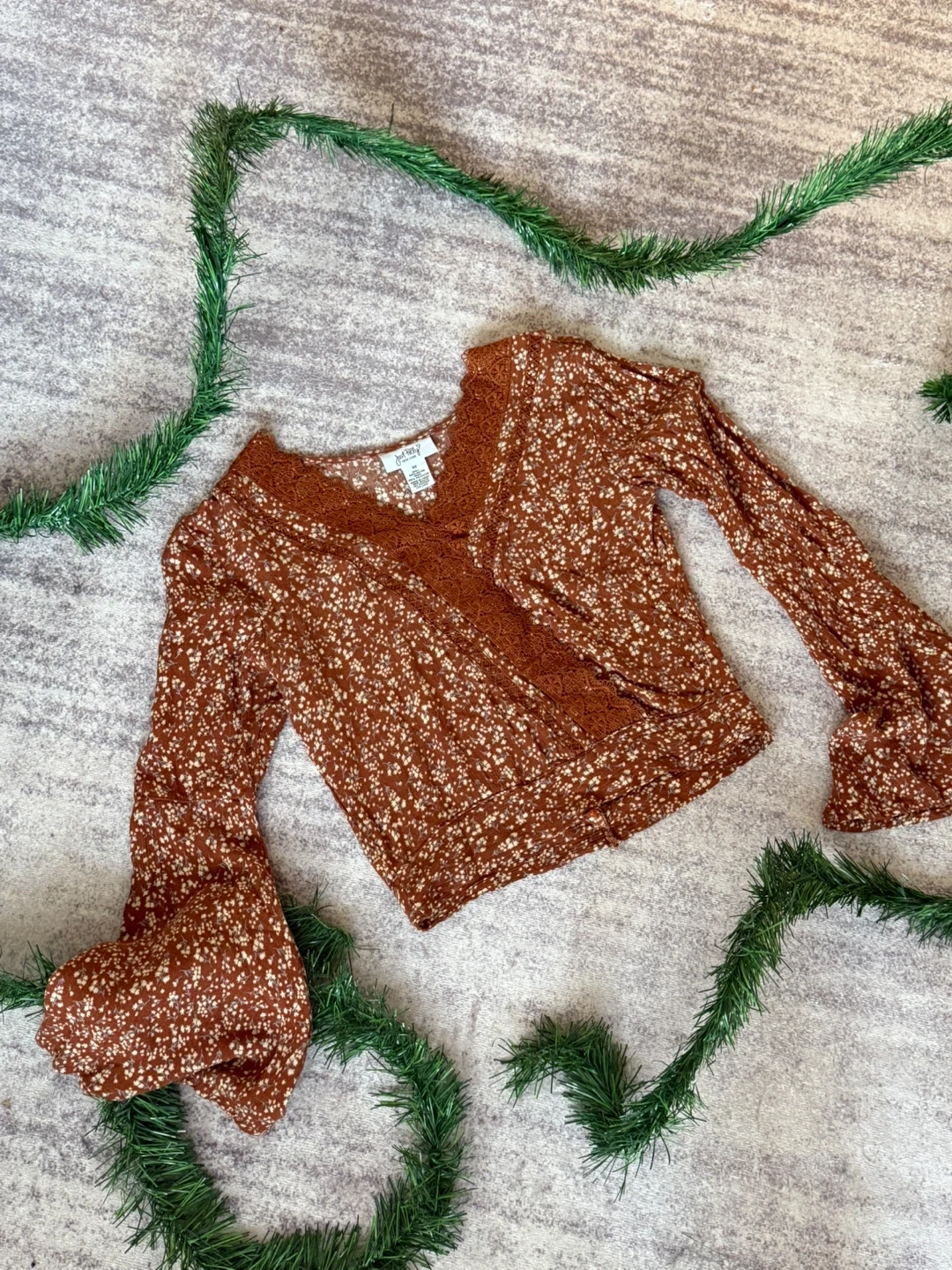 60This is a Just Cozy long sleeve top with a floral print! It features a V-neckline with lace trim and a wrap-style front. The sleeves are long and slightly flared. It's a cute and stylish piece!