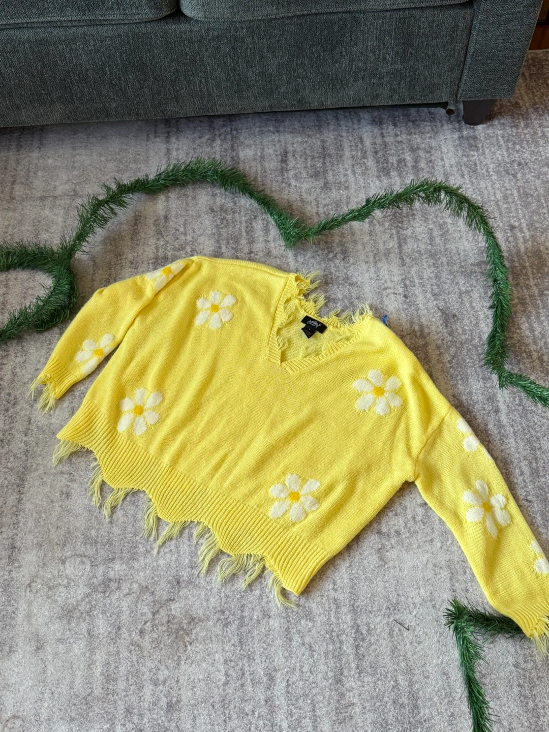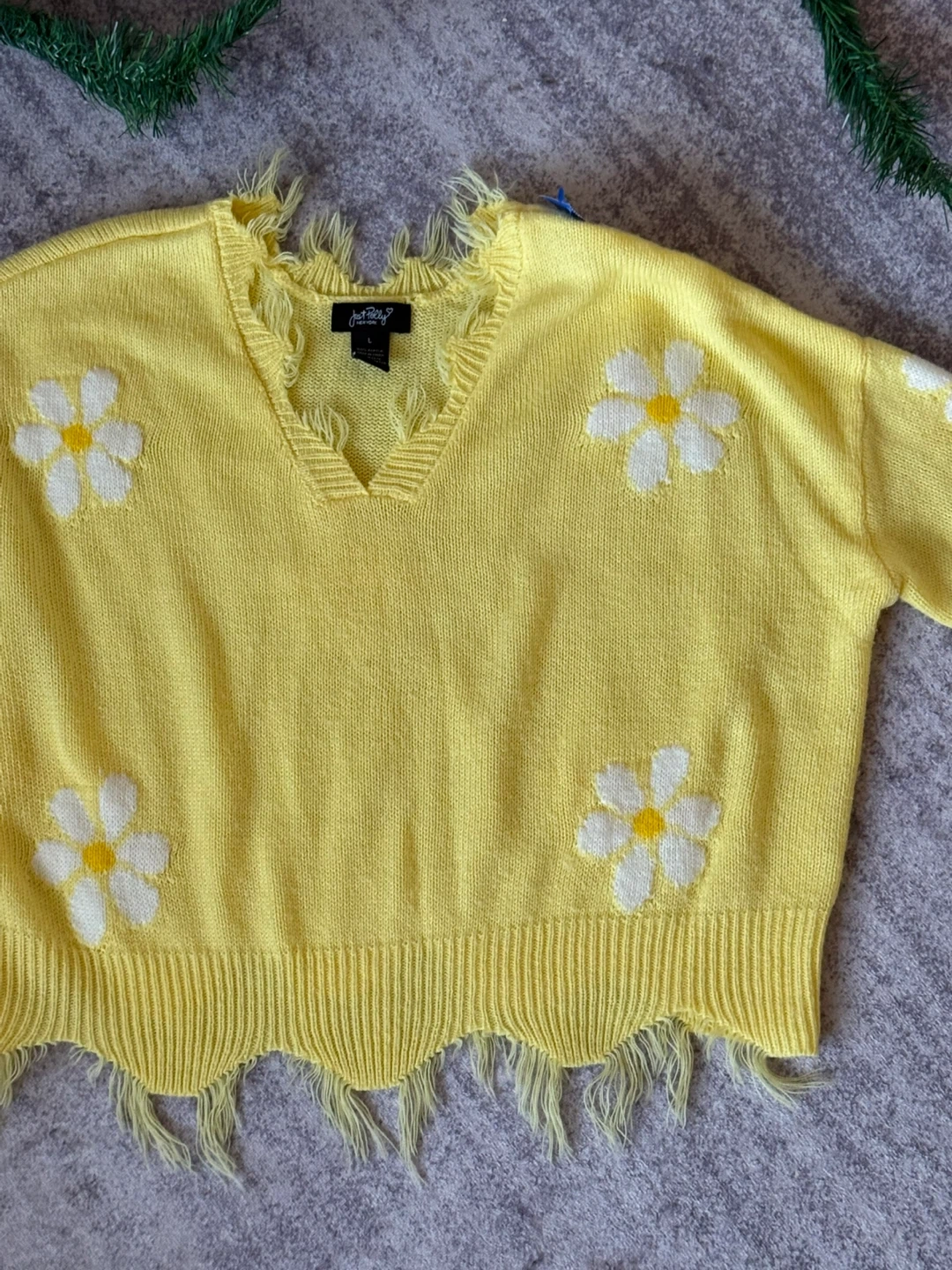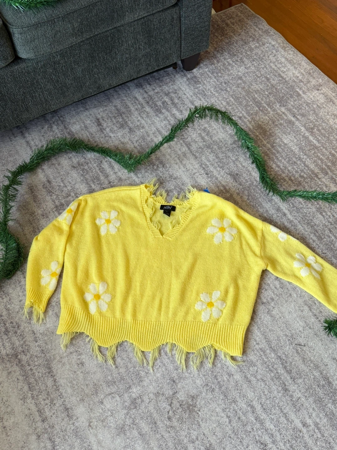 60Selling a cute yellow sweater from Just Living! It features a V-neck and adorable daisy designs. The sweater has a unique, distressed fringe along the bottom and neckline, adding a touch of fun to your outfit!